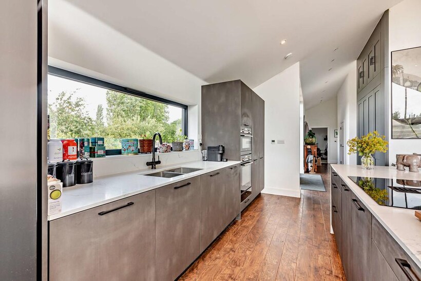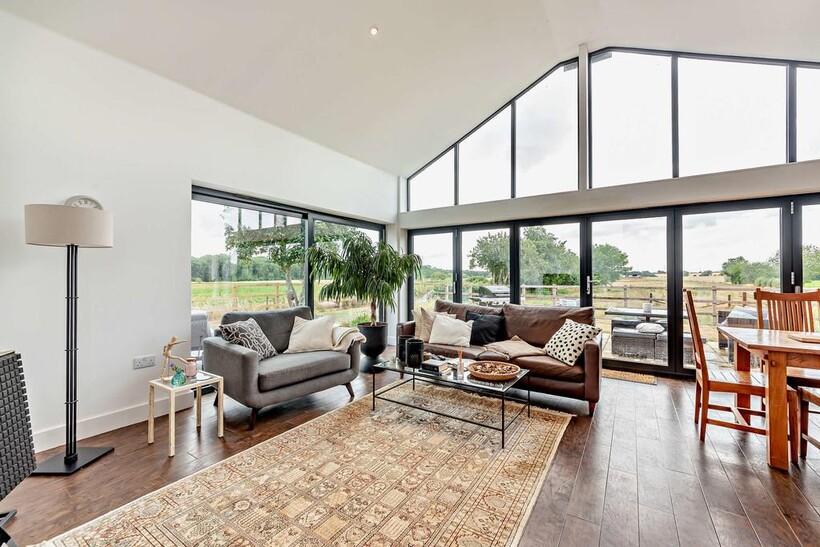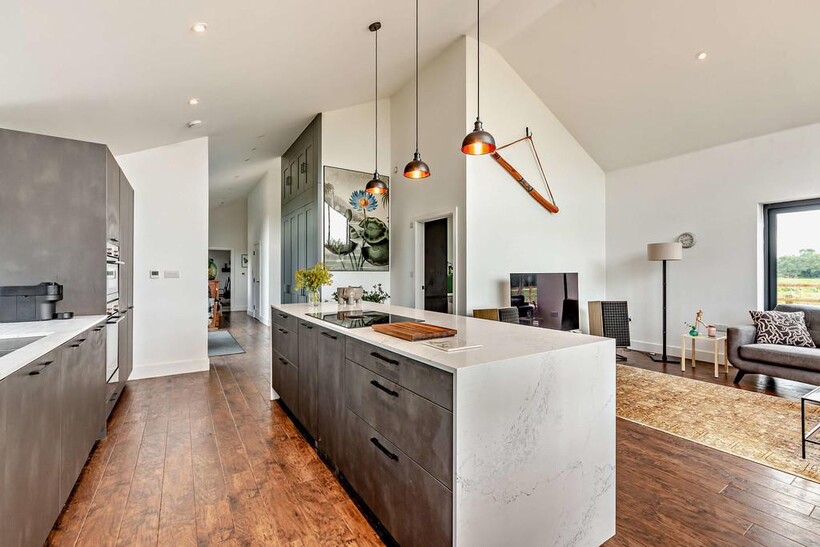 Impressive open plan kitchen/dining/living area with vaulted ceiling & country views