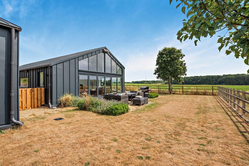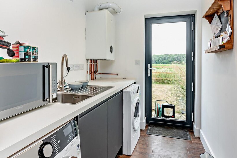 DESCRIPTION Whitehill Barn was built in 2021 to a high specification with bespoke features such as the entrance door leading into the hallway off which there is direct access into the wonderfully light open plan living/dining/kitchen area which has two sets of doors leading onto two patio areas making it a wonderful space to entertain. Vaulted ceilings and expansive windows further enhance the light and views across the garden and surrounding fields. Integrated appliances such as the large American style fridge/freezer, dishwasher, hob and oven will remain. There is a separate utility room with a washing machine which can stay and a further space for tumble dryer as the existing one will be removed. There is also direct access to the garden.