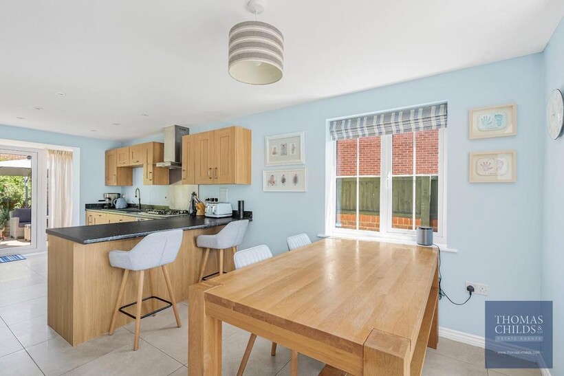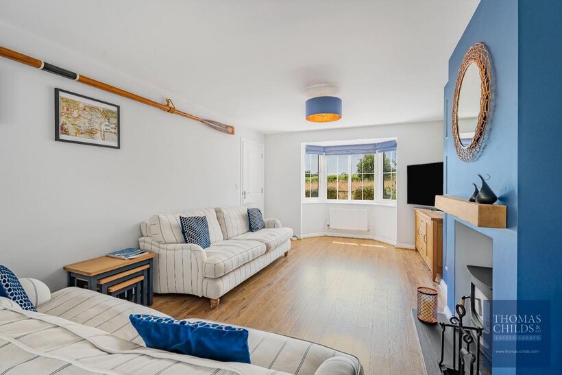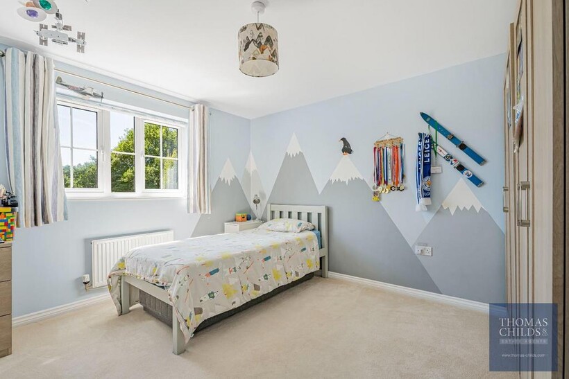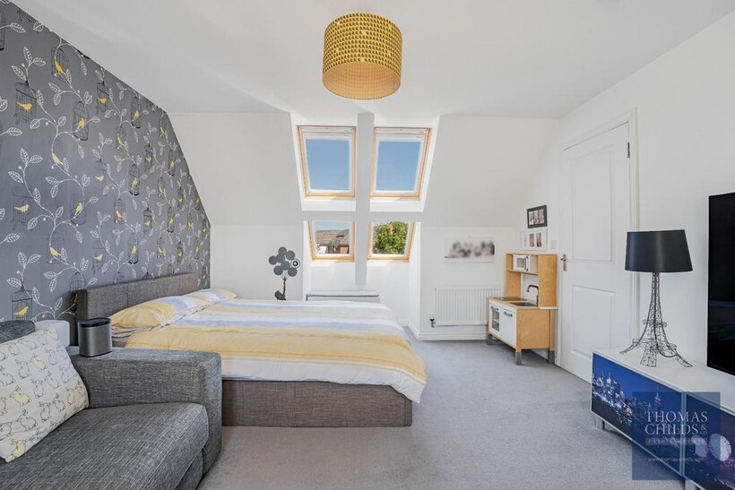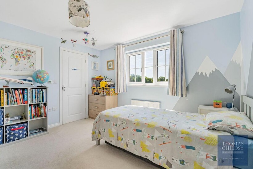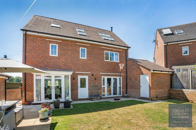 The upper floors include five double bedrooms and four bathrooms. The first floor includes the principal bedroom with a dressing area and en-suite shower room, and the second bedroom is a double and includes an en-suite shower room. The third bedroom is a small double, and there is a family bathroom on the landing. The second floor offers a large bedroom/games room and the fifth bedroom with an en-suite shower room.
