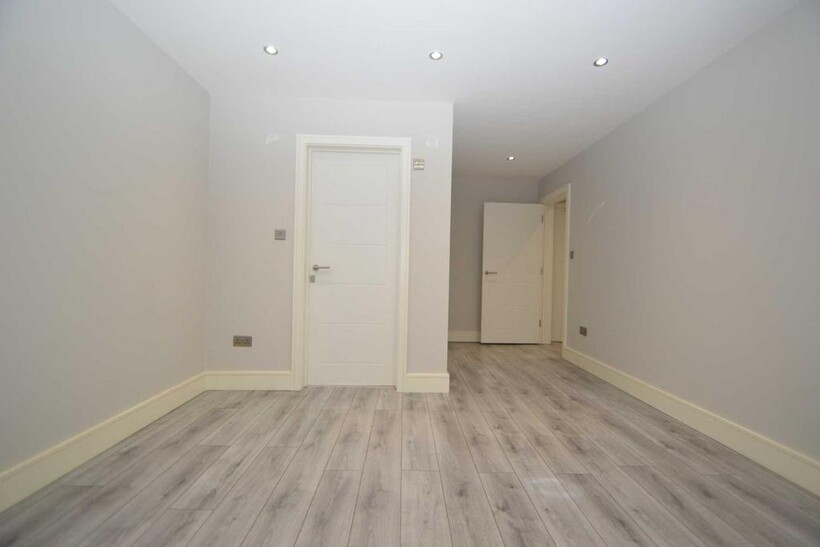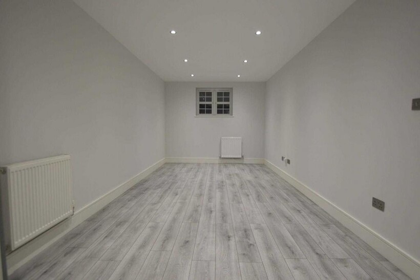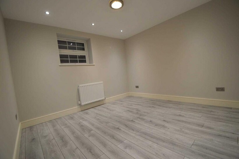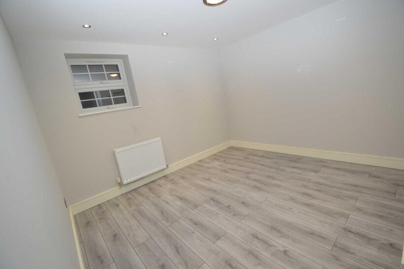 Wall mounted radiator, wood laminate flooring and ceiling recessed down lights. Double glazed window.