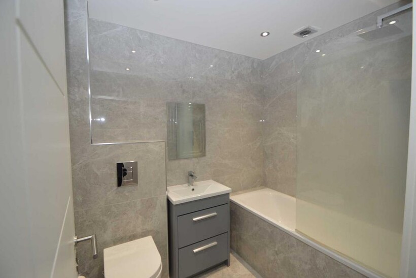 A fully tiled bathroom with white suite comprising a panel enclosed bath with separate over bath shower with hand shower and rain shower, shower screen, vanity unit inset wash hand basin with drawers below and wall mounted back to the wall w/c. With ceramic tiled flooring, ceiling recessed down lights, wall mounted mirror, extractor fan and ladder style chrome radiator.