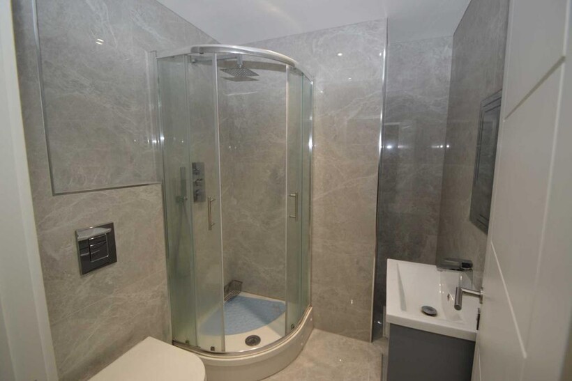 A fully tiled bathroom with white suite comprising a walk in shower cubicle with hand shower and rain shower, shower screen, vanity unit inset wash hand basin with drawers below and wall mounted back to the wall w/c. With ceramic tiled flooring, ceiling recessed down lights, wall mounted mirror, extractor fan and ladder style chrome radiator.