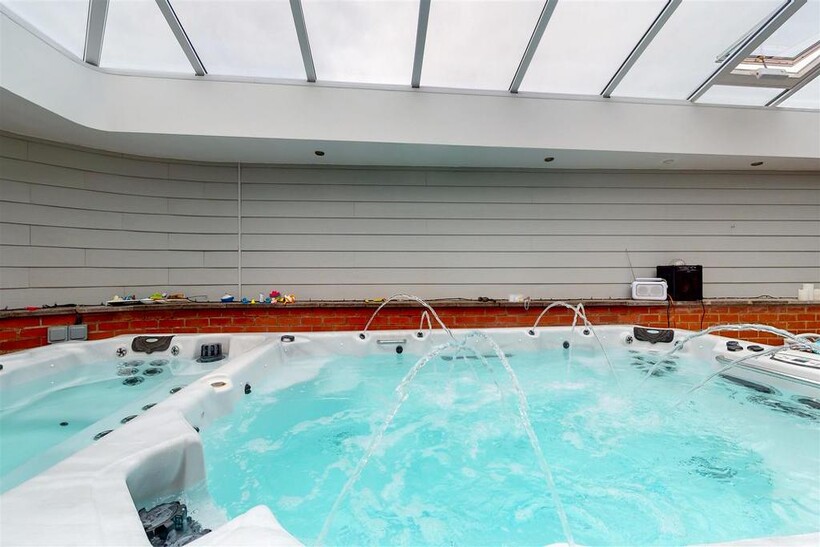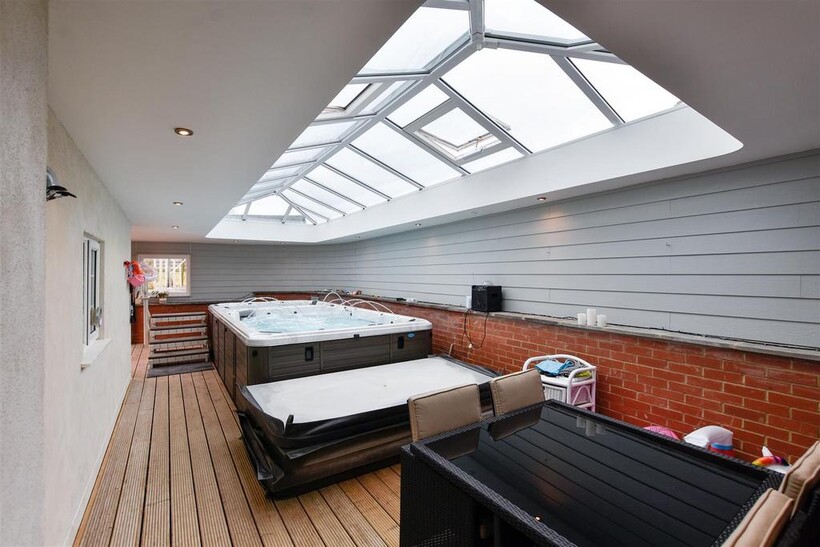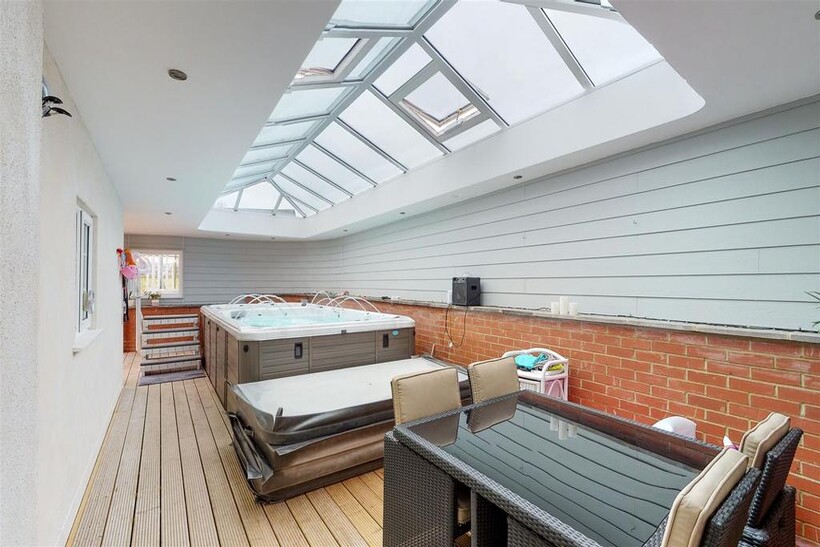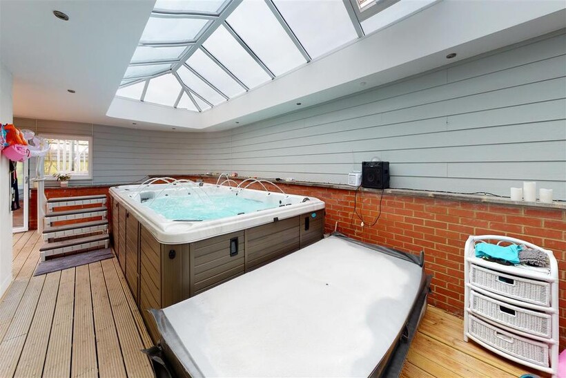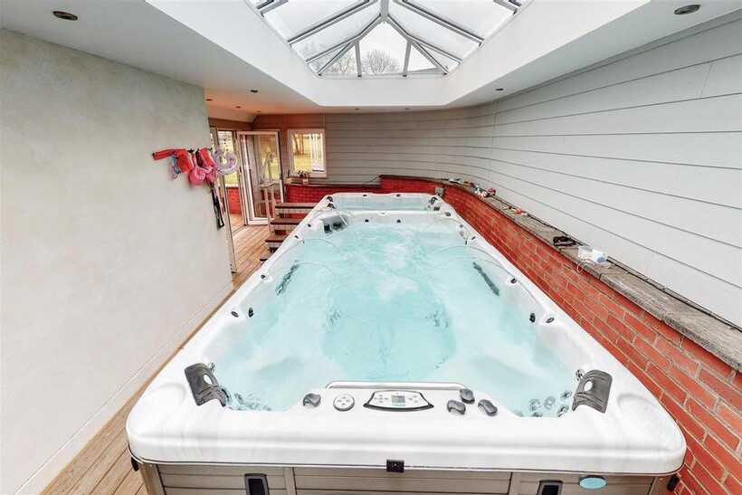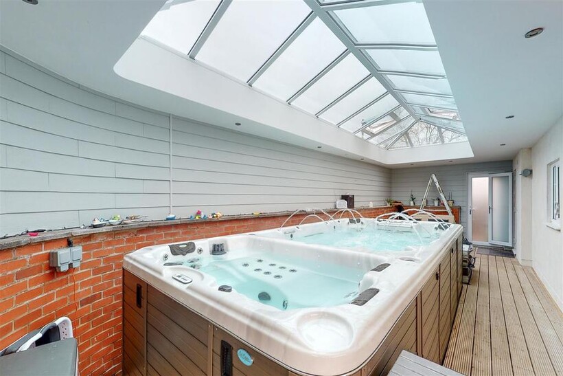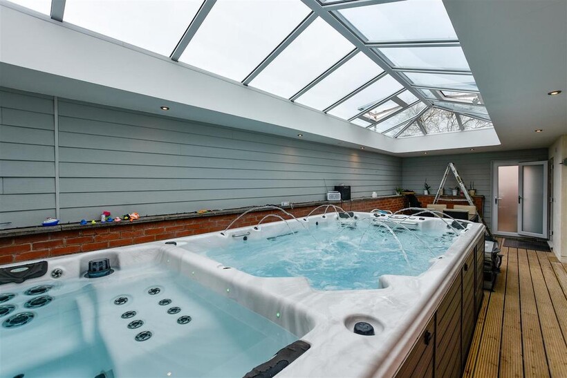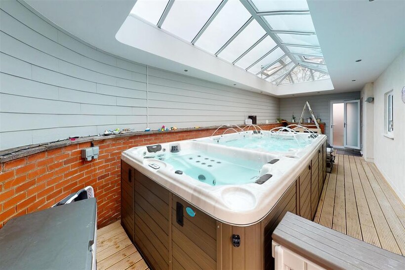 Pool Enclosure With Atrium Roof - 11.53m x 3.63m (37'10" x 11'11") - Impressive extension to the side of the property housing CALSPA Ultimate Fitness swim spa F1770. Impressive atrium roof, door leading to the front of the property and bi-folding doors leading to the rear garden. (Pool & Hot tub not included but may be available under separate negotiation).
