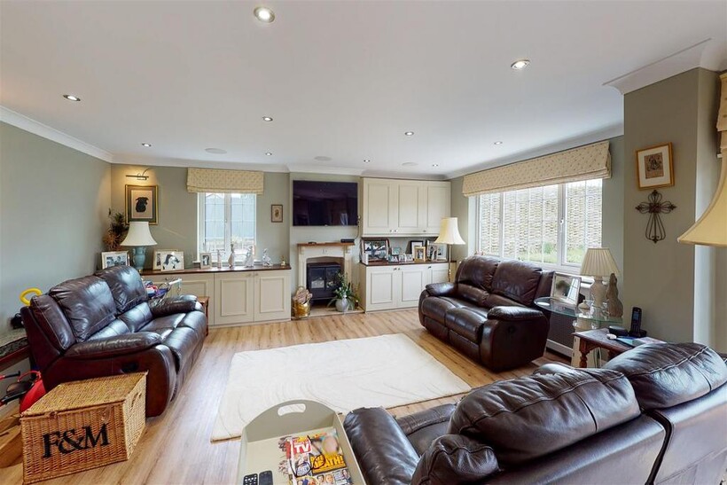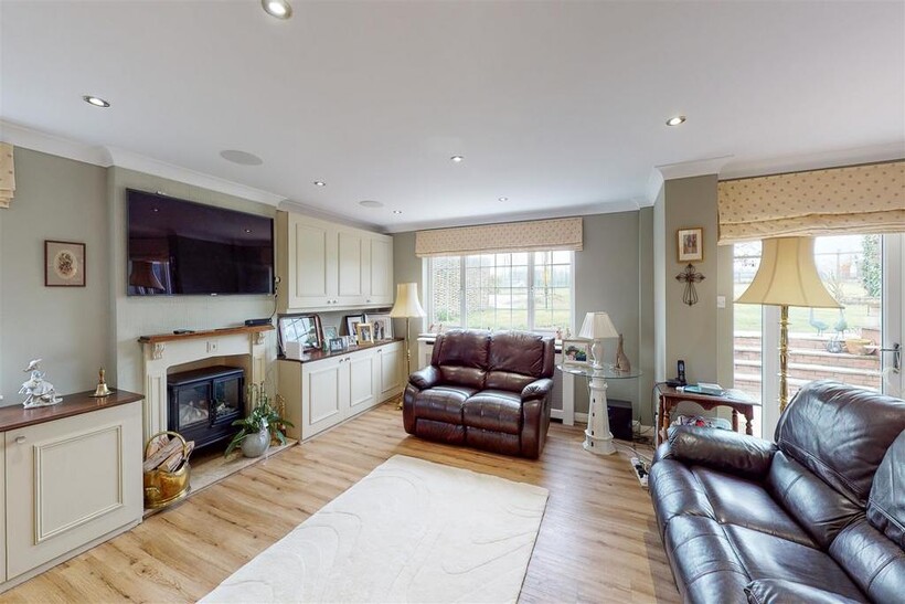 Opening into living space with dual aspect windows and double glazed doors leading to rear garden. Fitted units and feature fireplace with electric log burner.