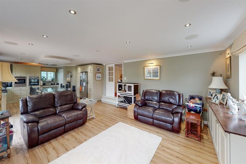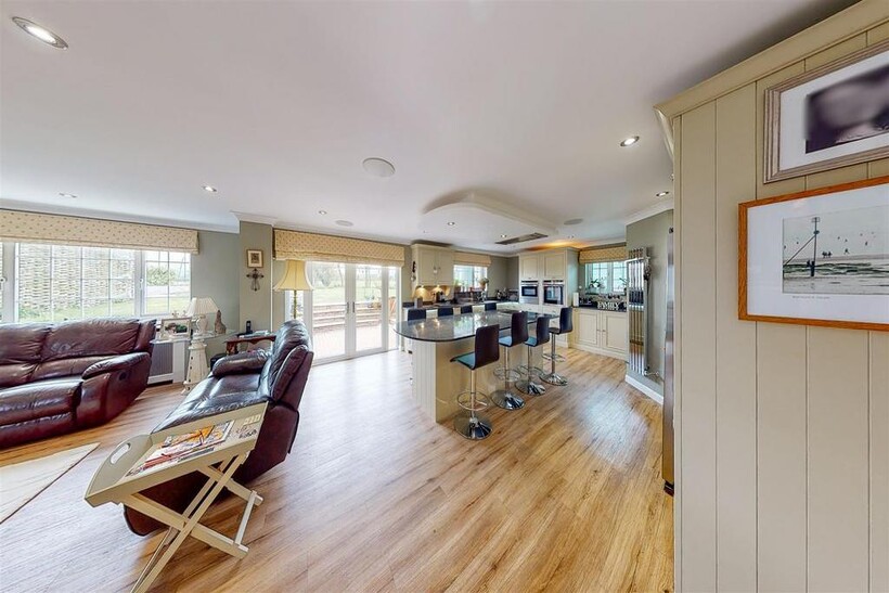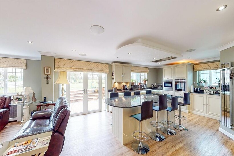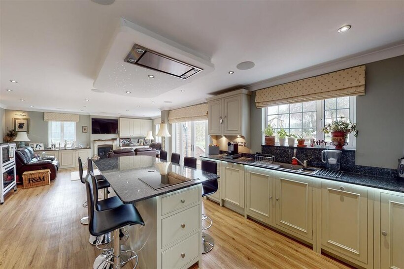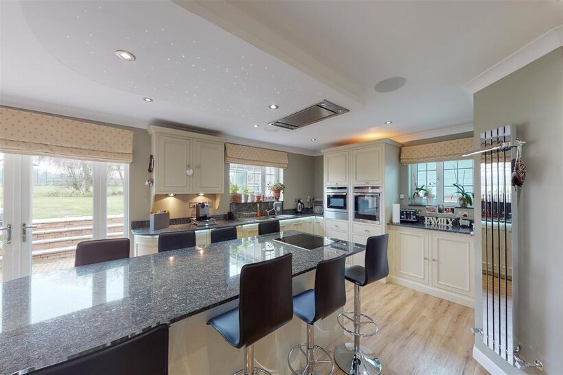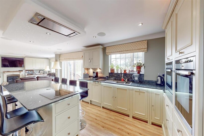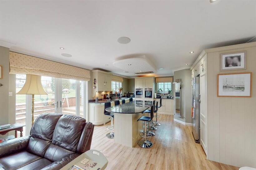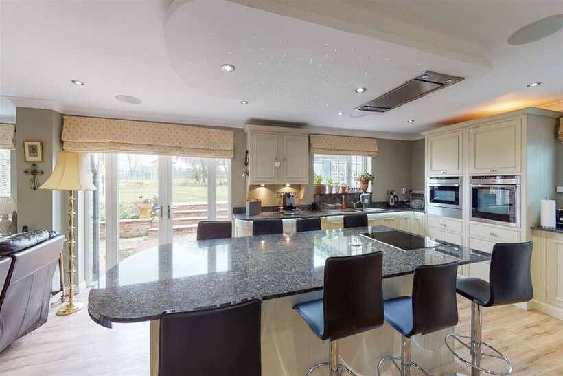 Kitchen / Open Plan Living Space - 6.11m x 11.00m (20'1" x 36'1") - Neptune kitchen with a wide selection of wall and base units, including an island breakfast bar with inset Neff hob and ceiling cooker hood. Eye-level Neff oven and combi-oven with plate warmer below. Integrated dishwasher and space for American style fridge freezer with larder units either side with pull out drawers. Walk in pantry, granite work-surfaces and feature lighting including constellation lighting over island.
