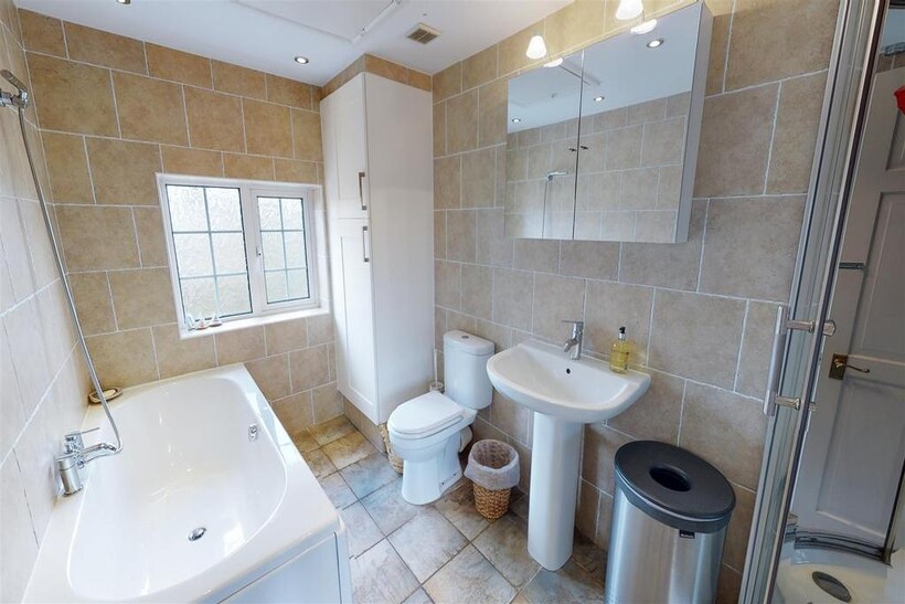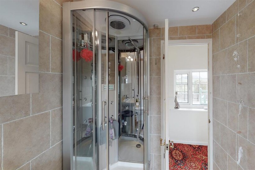 Family Bathroom - 3.51m x 1.93m (11'6" x 6'4") - Fully tiled room with four piece bathroom suite comprising of double ended panel bath, corner super-room steam shower house, low level WC and hand wash basin. Heated towel rail and window to front aspect.
