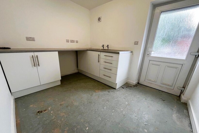 Kitchen - 2.16 x 2.77 - featuring UPVC door leading to rear, extractor fan, variety of kitchen units, stainless steel sink with drainer, strip light fitting.