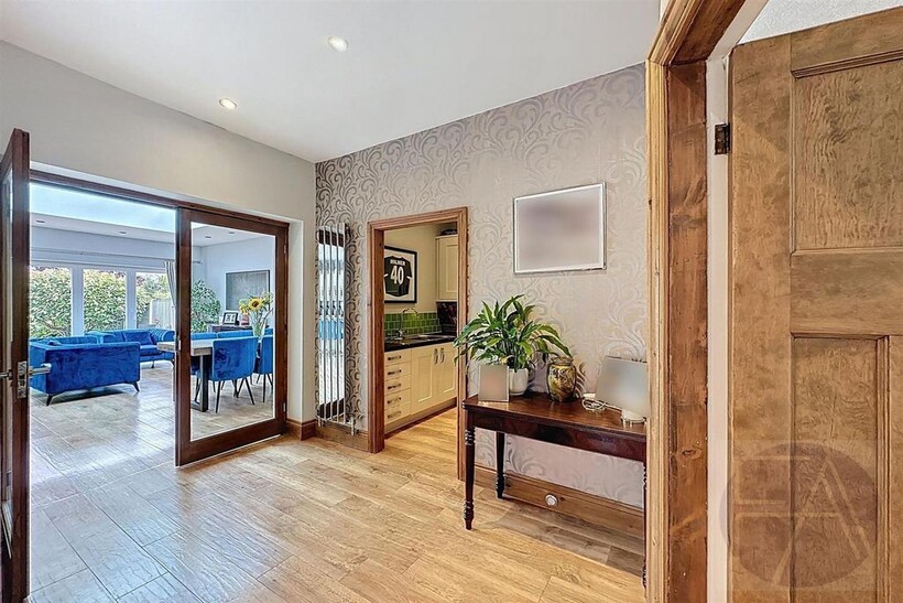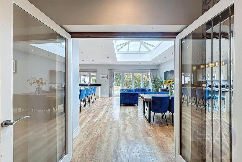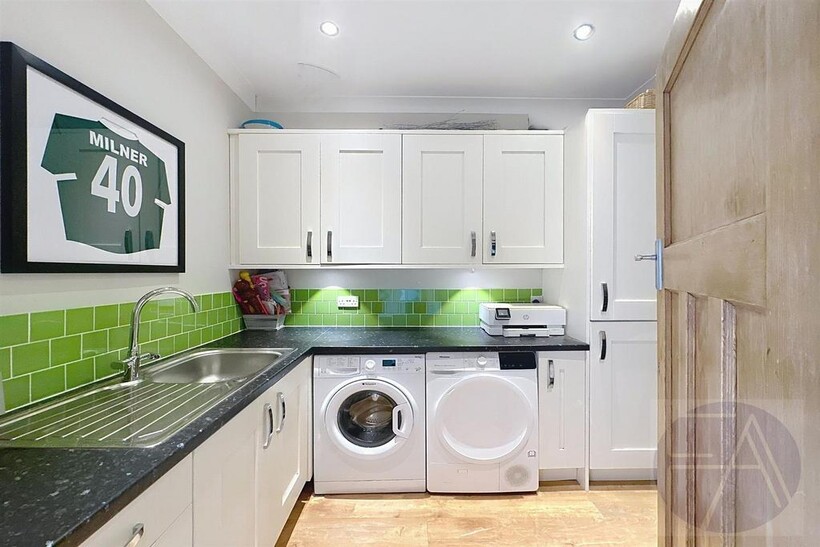 The ground floor comprises a welcoming entrance hallway with a downstairs WC, two spacious reception rooms with bay windows, and a stylish open-plan kitchen/dining area with integrated appliances and bi-folding doors opening onto the rear garden. A large utility room completes the floor.