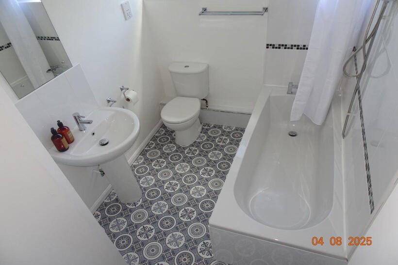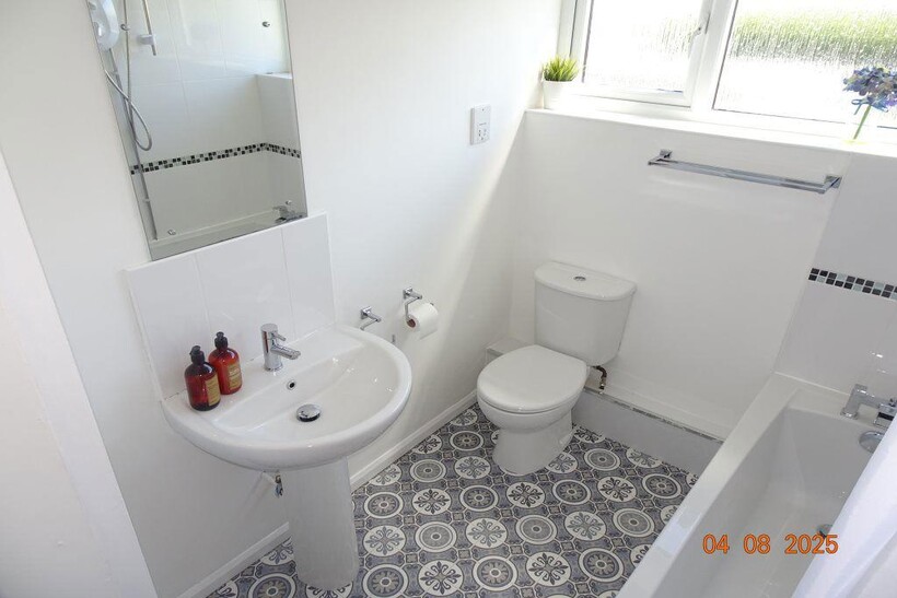 Two good sized bedrooms. Bathroom with full suite including panelled bath, WC and hand wash basin in white.