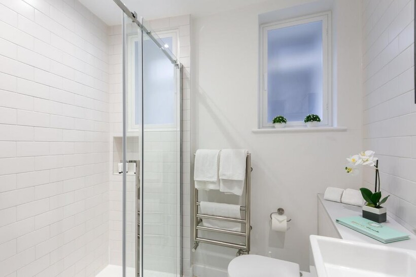 Featuring elegant wood flooring and floor-to-ceiling sash windows, the space is bathed in natural light and offers picturesque views. The fully equipped kitchen, soft towels, crisp linens, and sleek fixtures ensure a hassle-free and modern living experience.