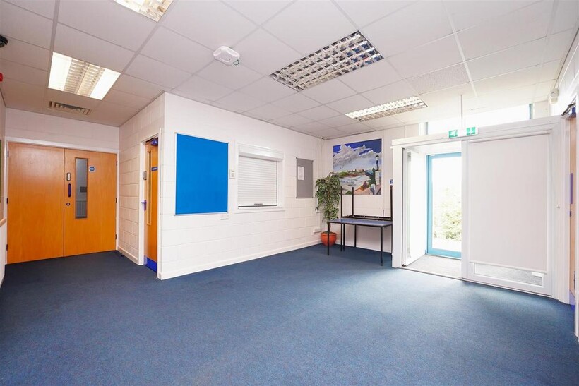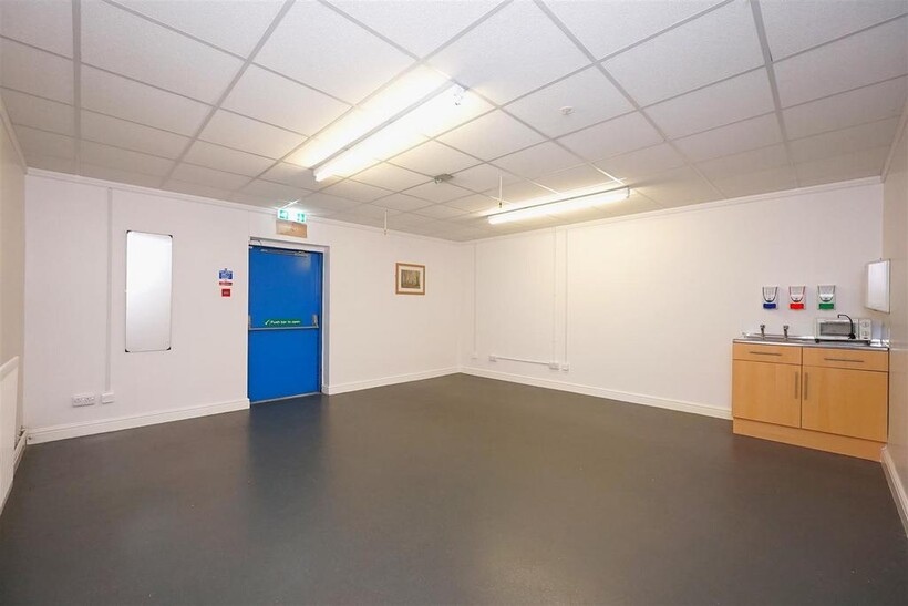 Open Room / Office - 13.72mft x 8.23mft (45ft x 27ft) - Hugh level ceiling, fluorescent lighting, three double radiators, electric power points, wall extractor fan.fire system, tv aerial. emergency exit door to the rear. Doors to the central hall.