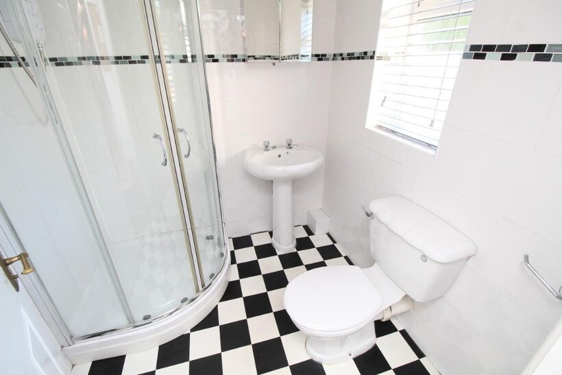 - Bathroom with shower cubicle, wash hand basin, and wc.
