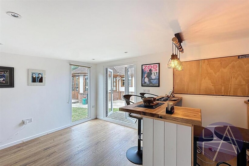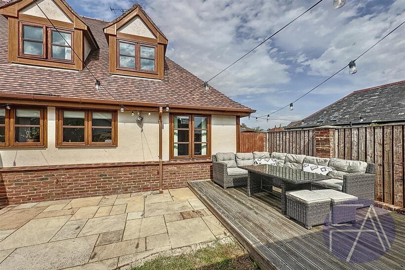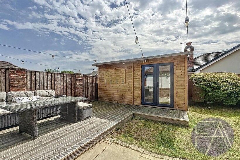 Sun drenched rear garden with summer house