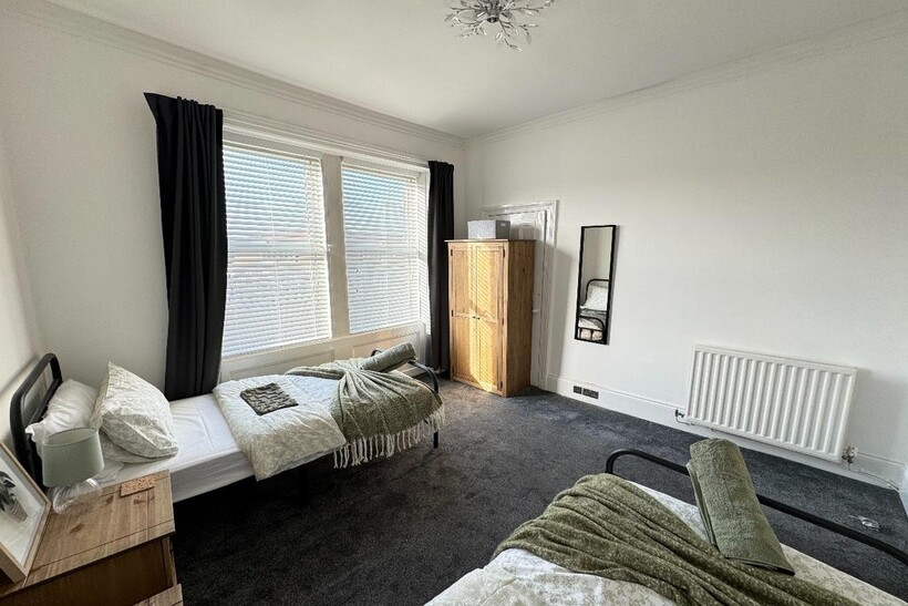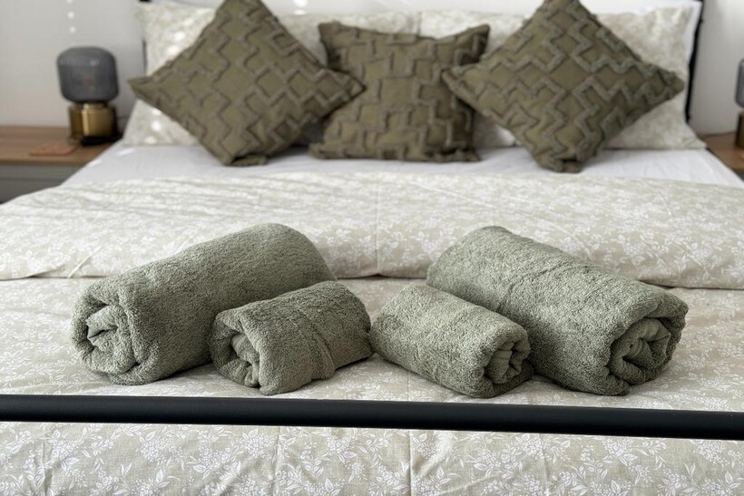 Both bedrooms are thoughtfully furnished with quality bedding, ensuring a restful night's sleep after a day of coastal adventures. The spacious master bedroom boasts a comfortable king-sized bed and fold away camp bed suitable for small/medium sized children !, while the second bedroom features twin beds, perfect for families or groups of friends. Ample storage space, with clean modern white decor, creating a peaceful ambiance that invites relaxation.