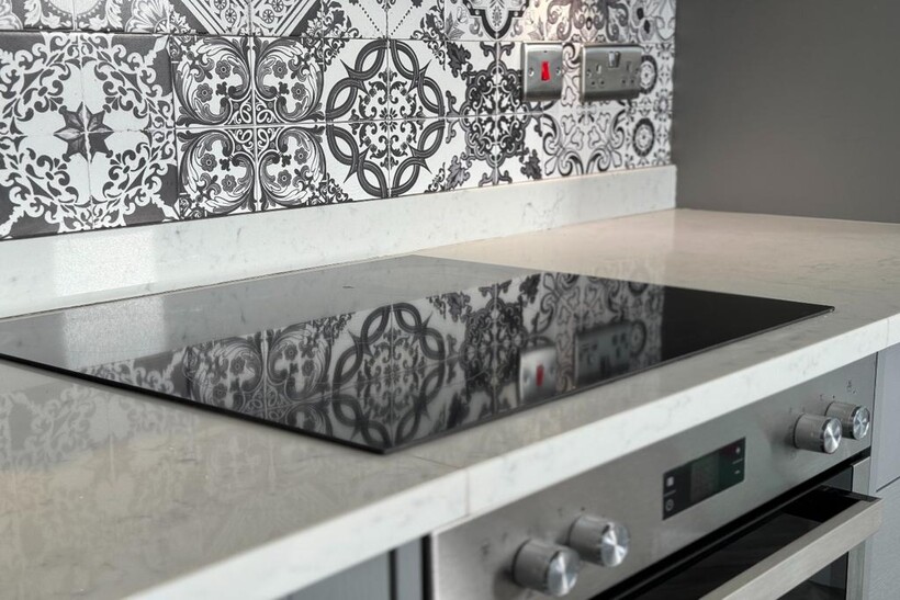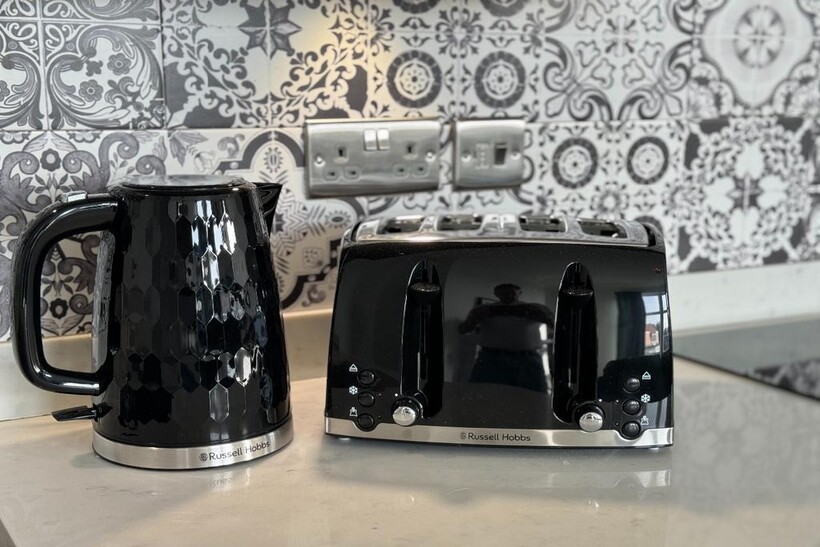 The apartment features a fully equipped newly fitted modern kitchen with Nescafé Dolce Gusto coffee machine (pods not included) and feature tiling, complete with appliances and all the essentials to enjoy lovely home cooked meals during your stay.