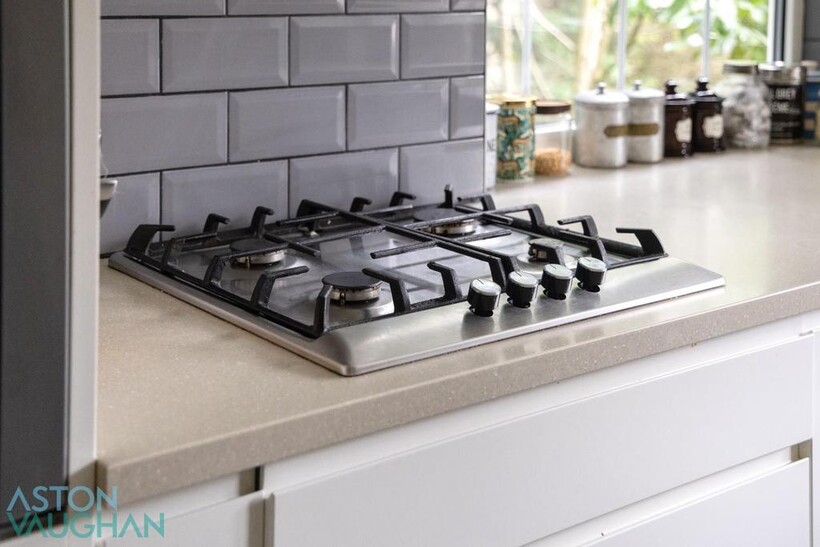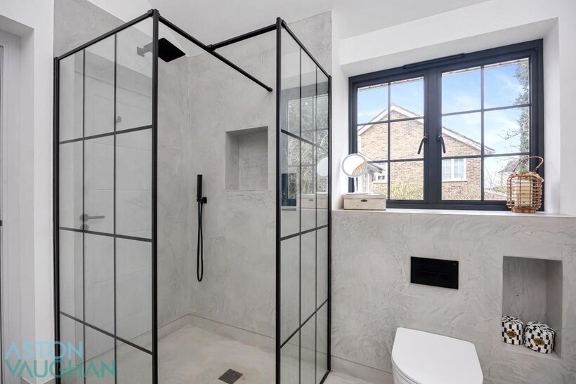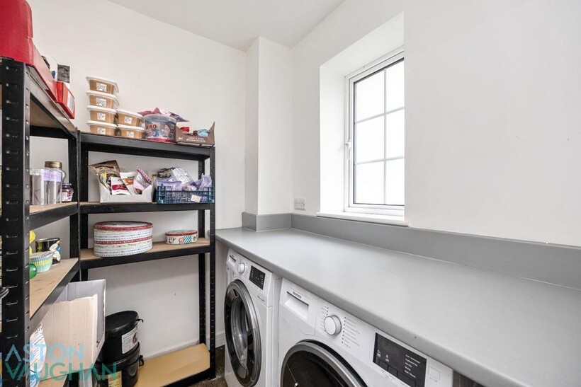 The high-spec kitchen is a true highlight, designed with both style and functionality in mind. Glossy white units at both base and wall levels are complemented by light-grey stone worktops that beautifully match the porcelain tiles beneath. The kitchen features an integrated range of top-of-the-line appliances, including a dishwasher, washing machine, dual ovens, gas hob, and sink with designer taps. There's also space for an American-style fridge-freezer, ensuring that you have plenty of storage for all your culinary needs. With views from every angle looking out to the lush garden or the peaceful close, you?ll feel connected to nature even while preparing meals. Adjacent to the kitchen is a dedicated baking room, equipped with everything you could need for baking bread, cakes, and more. Alternatively, this room can be used as a larder or additional storage space, offering flexibility to suit your needs.
