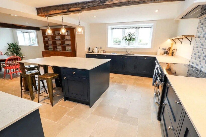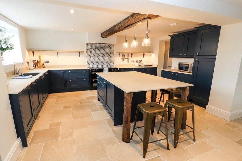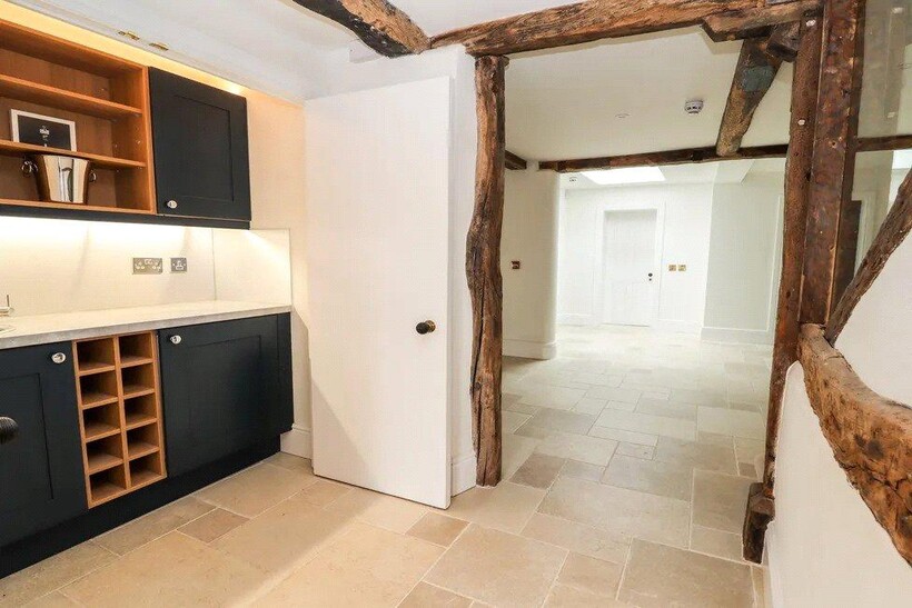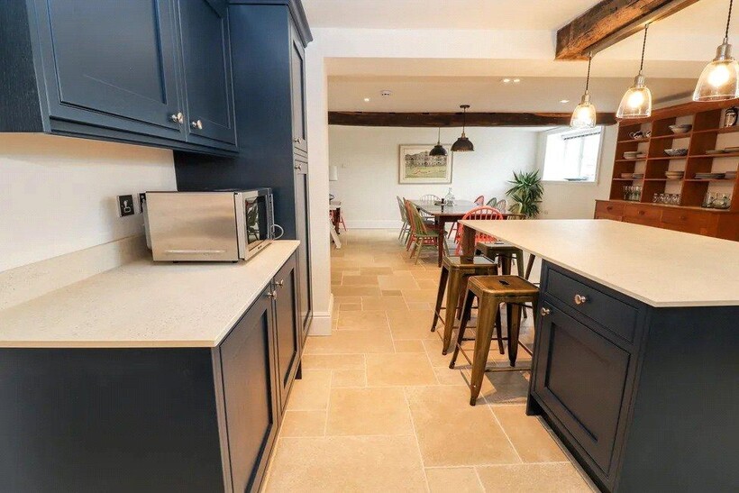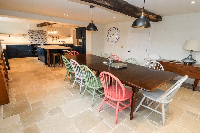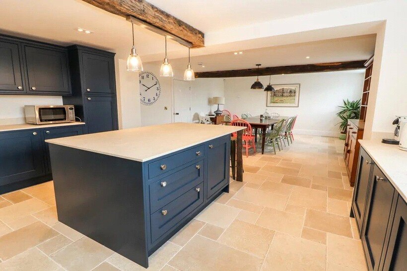 There is a large central island which doubles as a breakfast bar or you might choose to eat in the dining room, which is open plan to the kitchen. There is space for a large dining table to sit beneath wooden beams and suspended lights.