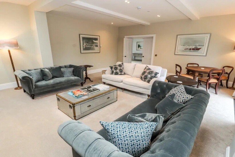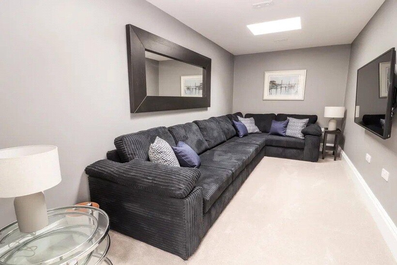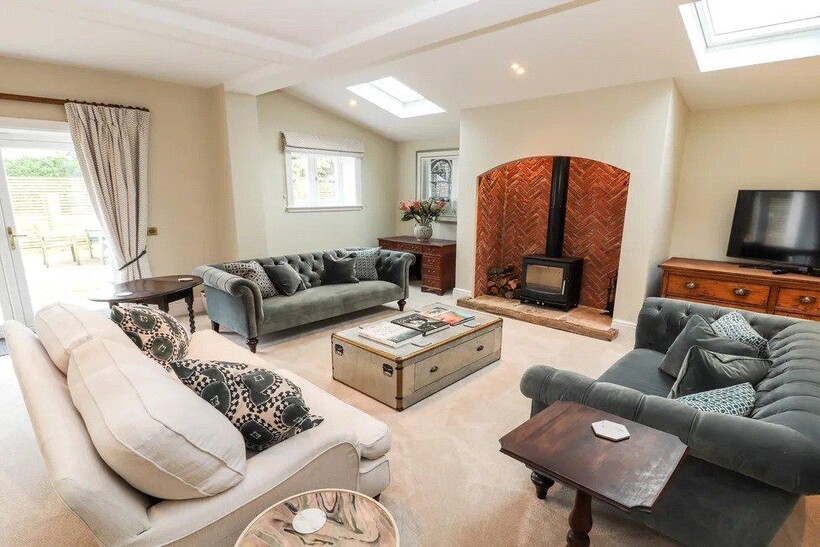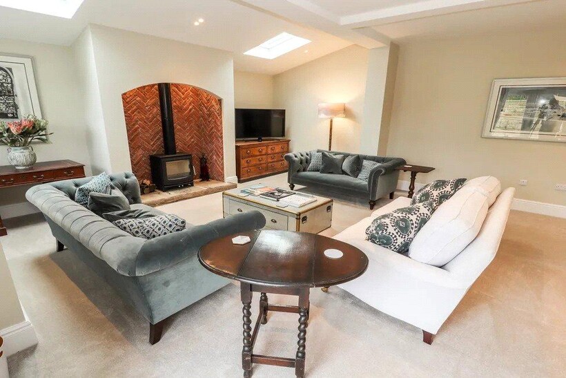 The sitting room offers room for additional dining if preferred, enjoying views of the garden from the patio doors. The ample size room easily accommodates three sofas around the feature herringbone brick fireplace, which houses the woodburning stove. An additional snug provides an ideal social space for the children to curl up and game or watch a film of their choice.