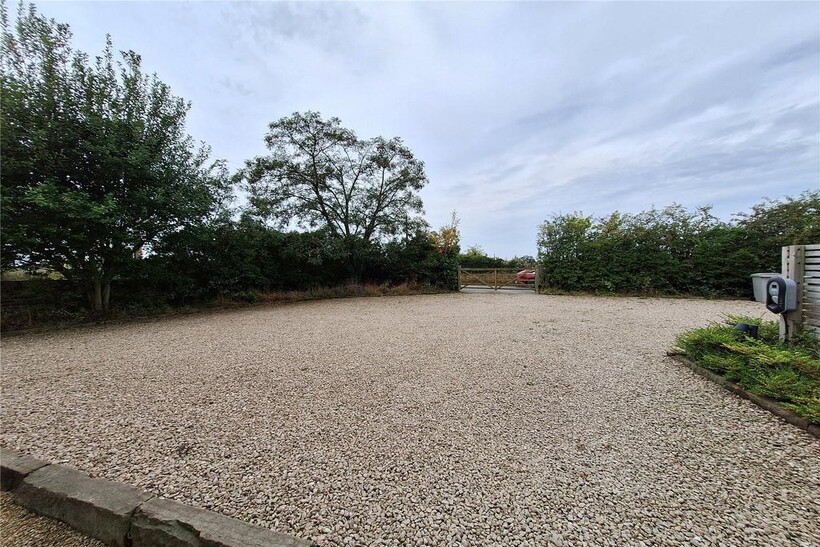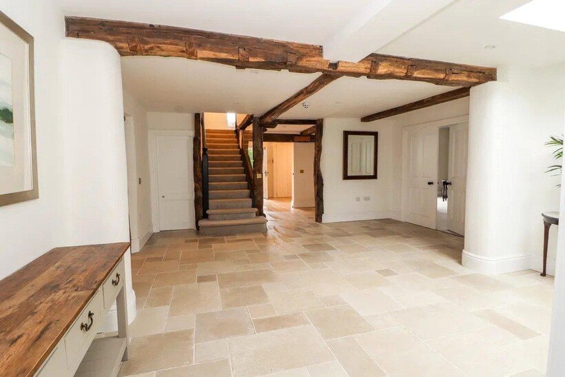 The property is accessed through a private gate, while ample parking can be found on the large gravel driveway. Make your way inside the property to discover a spacious and bright hallway, boasting wooden beams and a small bar area.