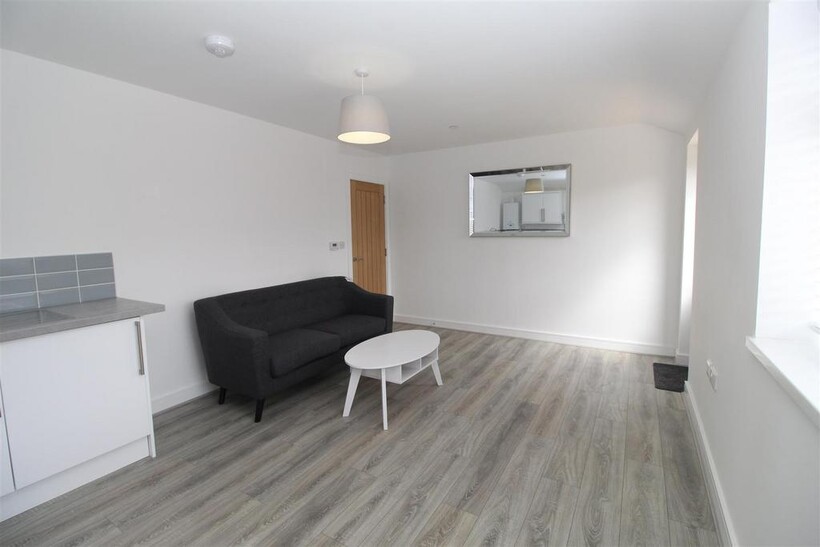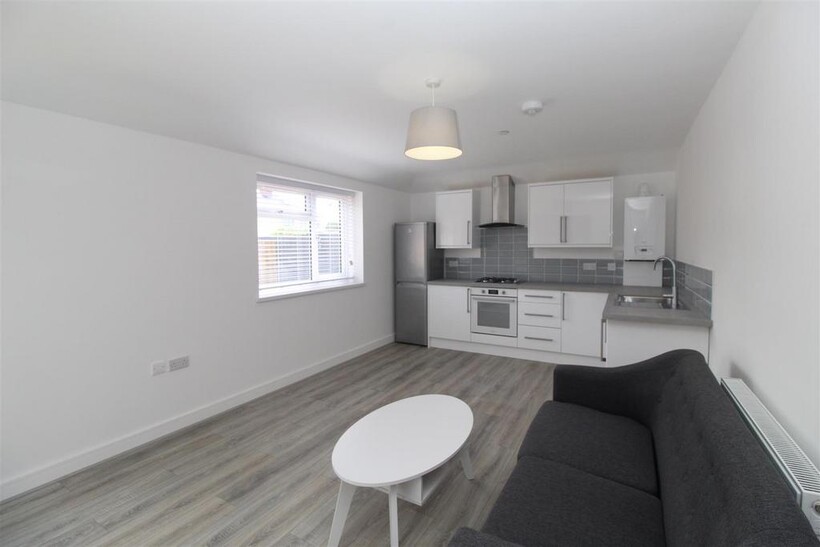 At the end of the hallway you’ll find a modern, light-filled open-plan kitchen and living space. The kitchen comes fully equipped with a fridge-freezer, oven, and hob, while the living area includes a sofa and stylish coffee table. There’s plenty of room to add a dining table — perfect for hosting friends or relaxed evenings in.
