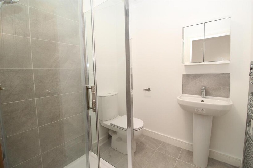 The inviting bathroom features premium slate style floor tiles and a large glass rainfall shower, creating a spa-like feel. Also included are a toilet, wash basin, mirrored toiletries cabinet, and a heated towel rail for added comfort.