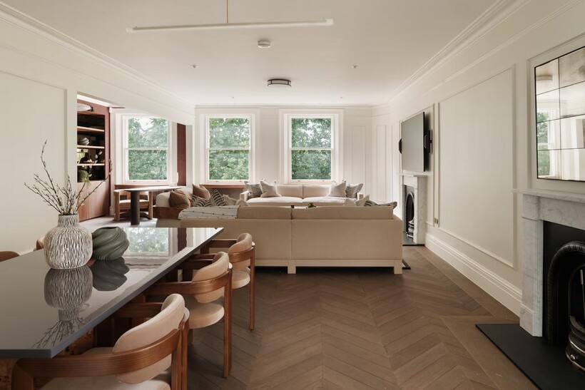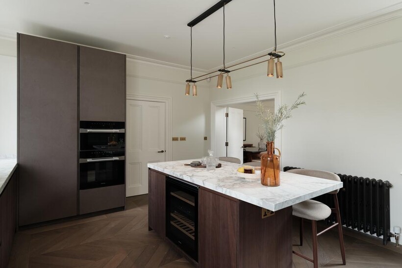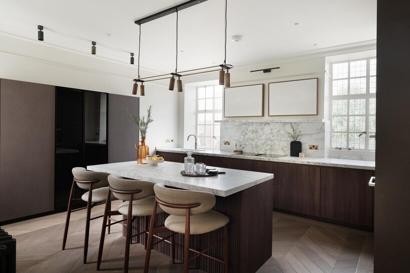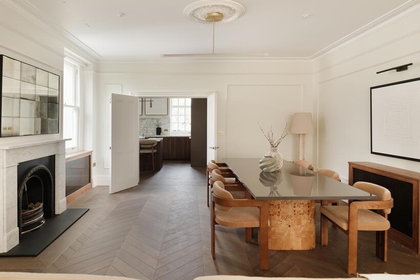 The kitchen is a showpiece of understated luxury, featuring honed marble worktops, an oversized island with breakfast seating, integrated top-of-the-line appliances, and warm wood cabinetry. It flows directly into the sophisticated dining space and onward into the elegant reception room; complete with period fireplaces, high ceilings, and refined custom finishes.