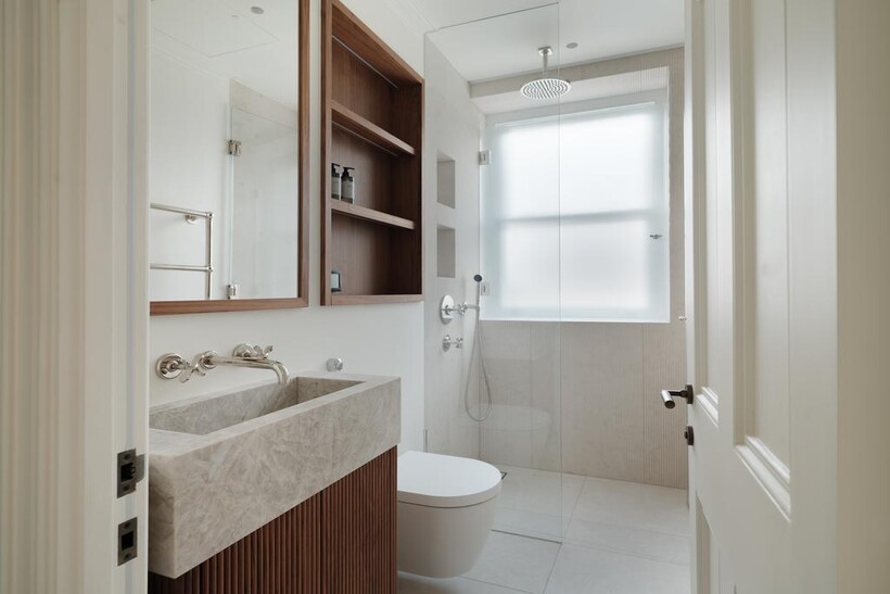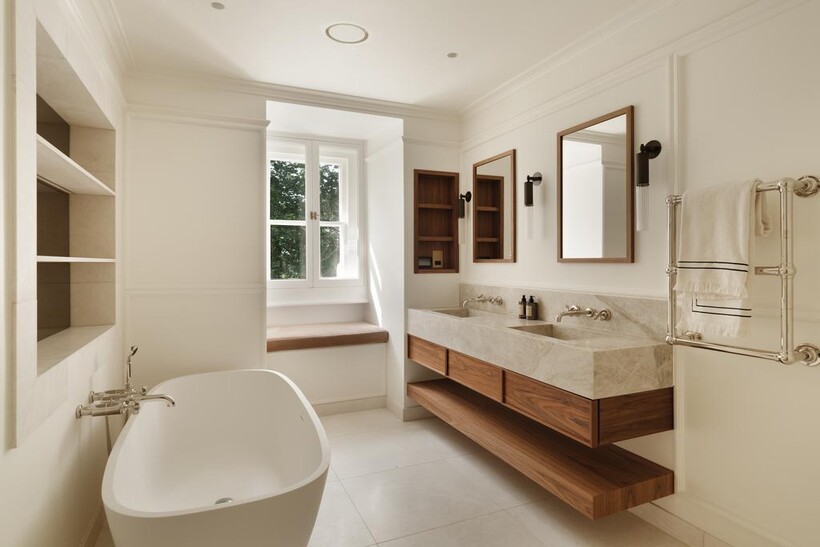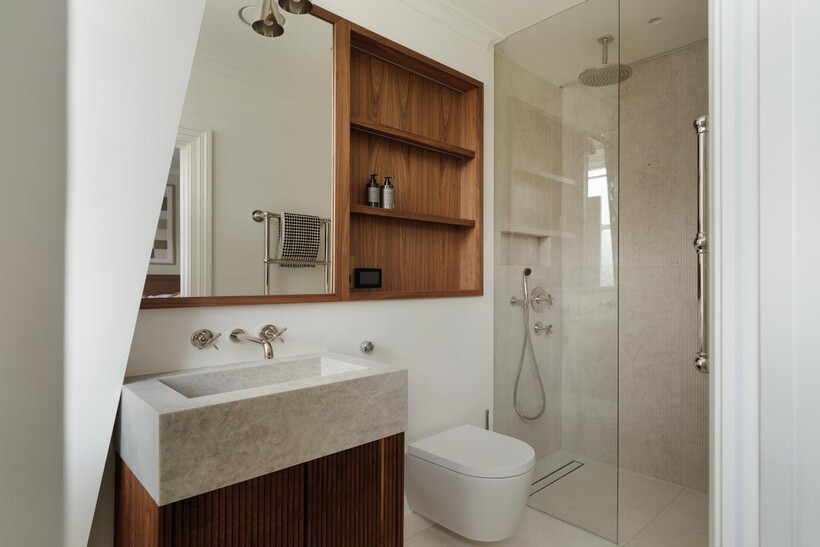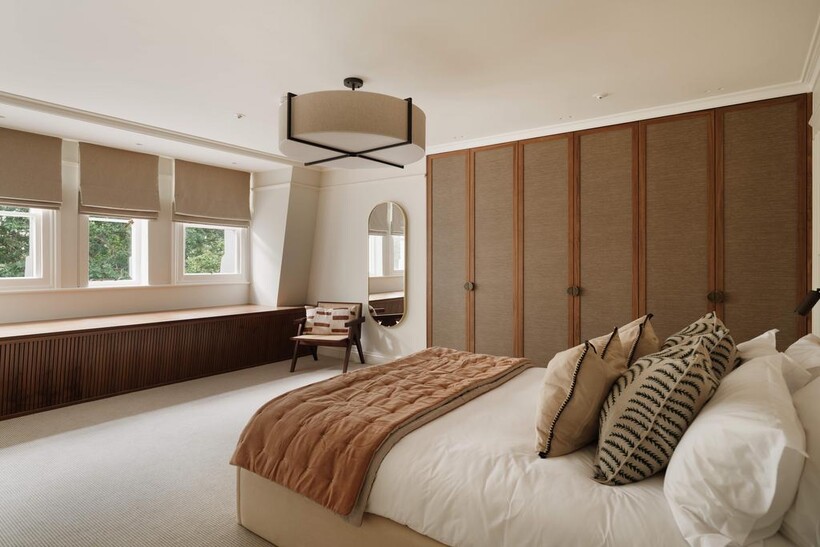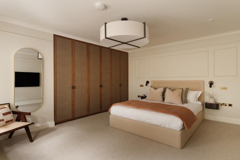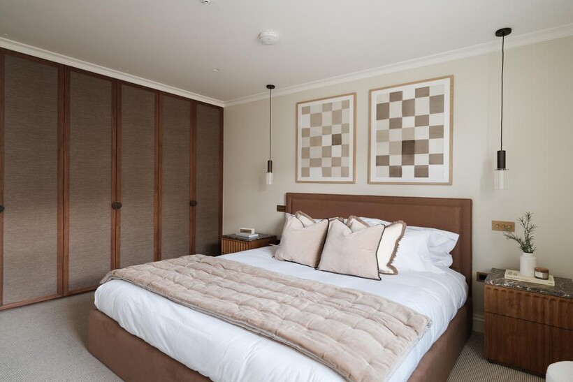 The third bedroom, also en suite, is elegantly finished with soft neutral tones, bespoke joinery, and hotel-quality fittings.