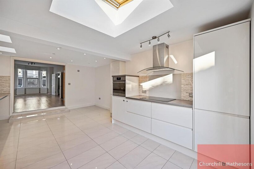 Modern fully fitted kitchen with dinning space, with bi-fold doors into a timber decked rear garden