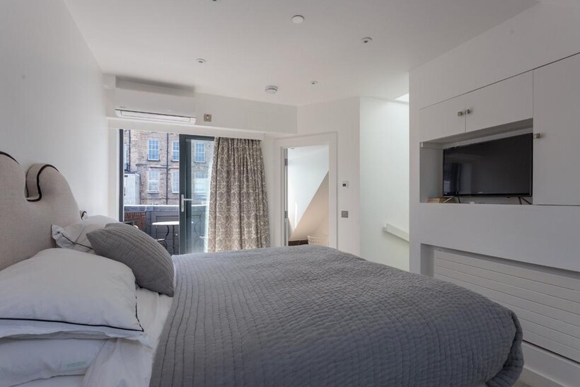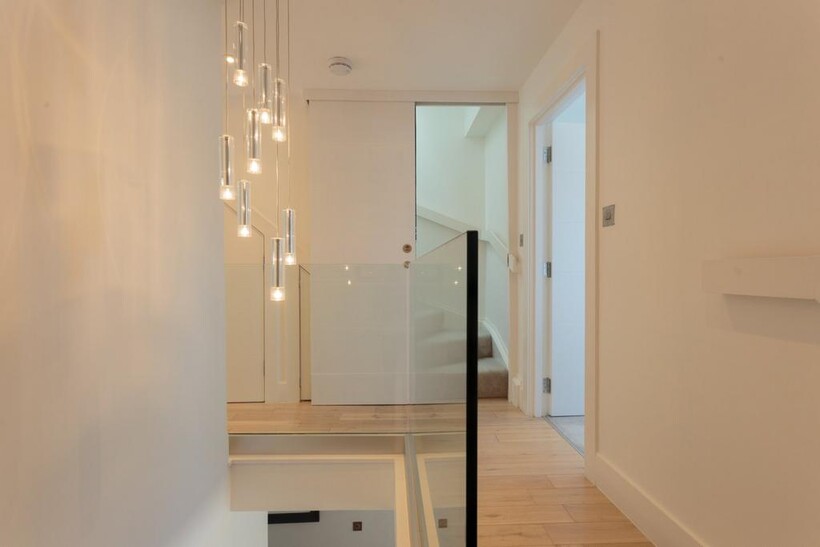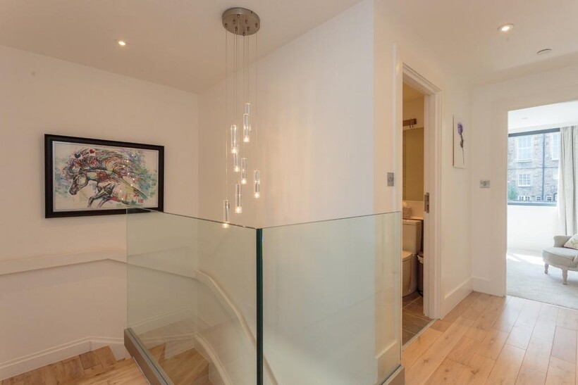Connecting the floors is a beautifully lit stairway that rises through the property, complemented by a modern glass-balustrade hallway and contemporary pendant lighting. On the third floor, the master bedroom offers air-conditioning, fitted wardrobe, a stylish en-suite, and access to a private, city-facing balcony - an ideal retreat for morning light and fresh air. The balcony itself is a charming south-facing space with room for a small table and chairs, offering picturesque views of neighboring Georgian façades.