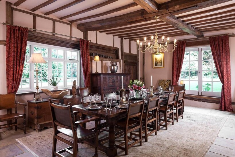 A grand dining hall provides one of many stunning focal points of the home. A sense of occasion can be experienced with high beamed ceilings, stone floors and an aged oak door granting access to the rear terrace and gardens. An impressively large exposed brick inglenook fireplace provides an exceptional focal point to the room, with an inset roasting rack.