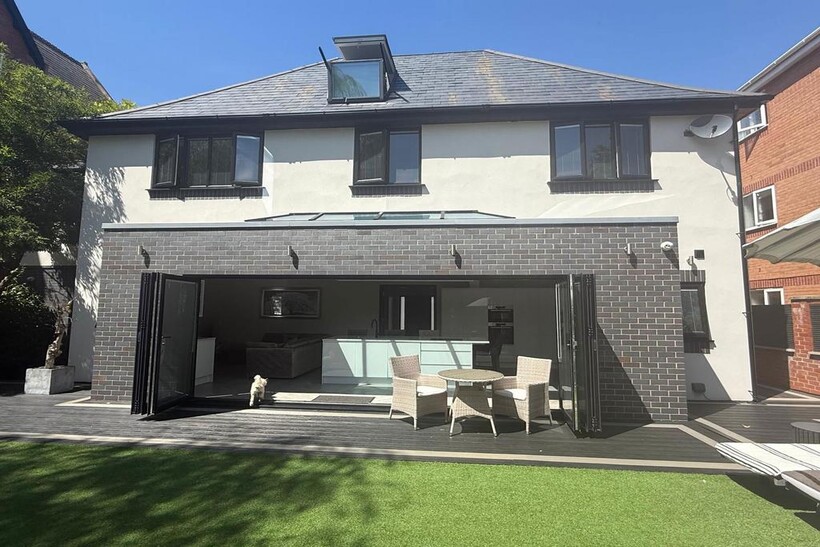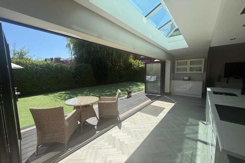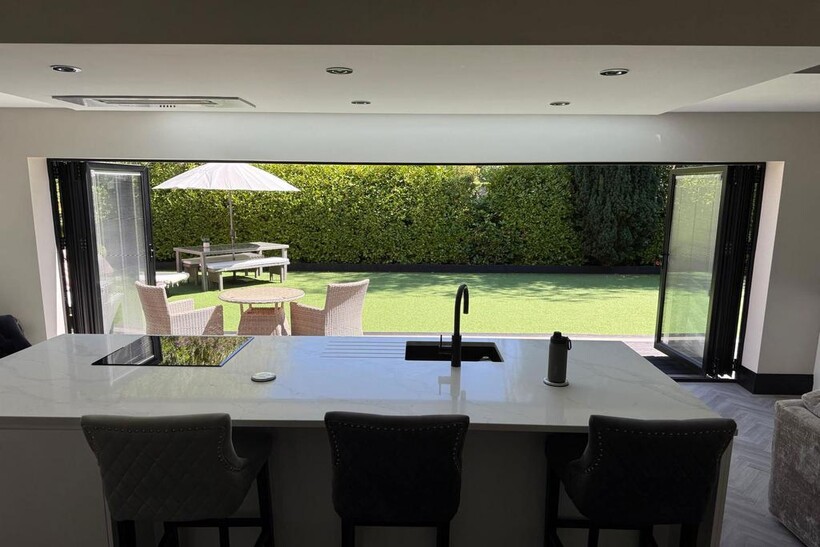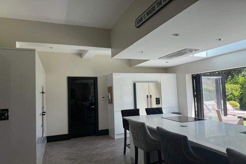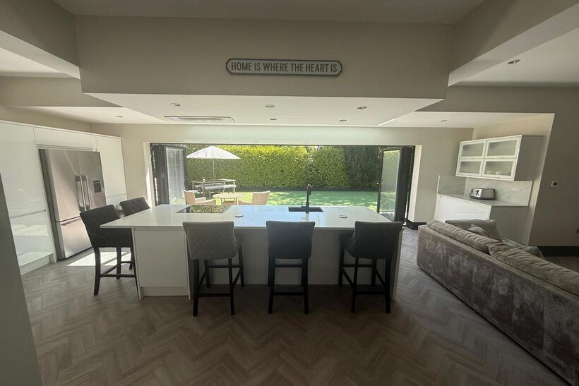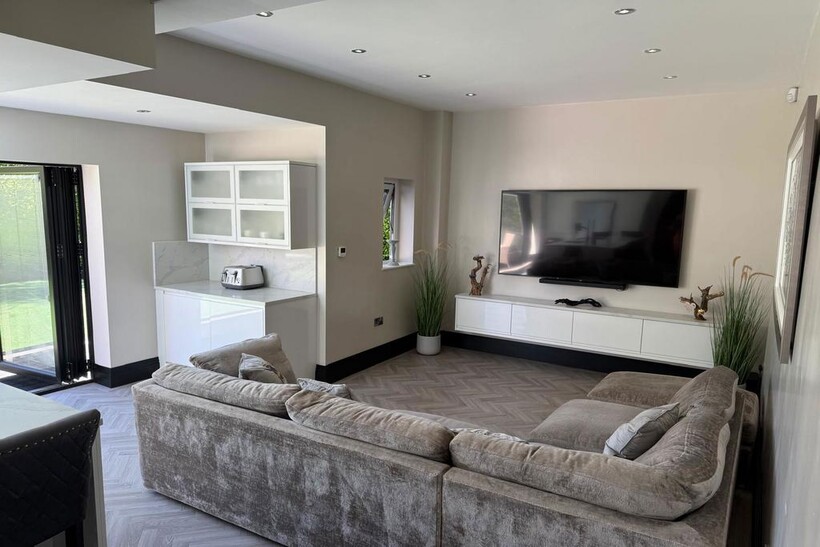 Large open-plan kitchen with snug area, Bose sound system, and bi-fold doors to rear garden