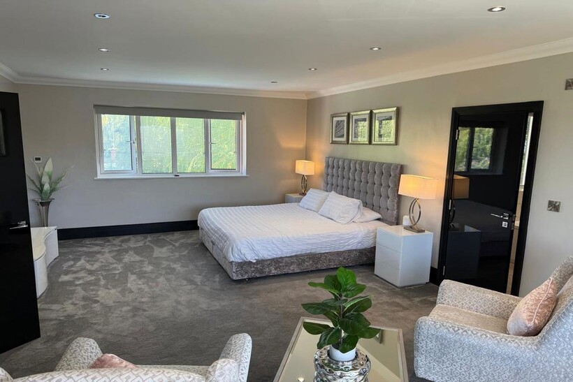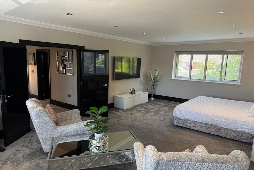 Master suite with queen-size bed, walk-in wardrobe, seating area, and en-suite