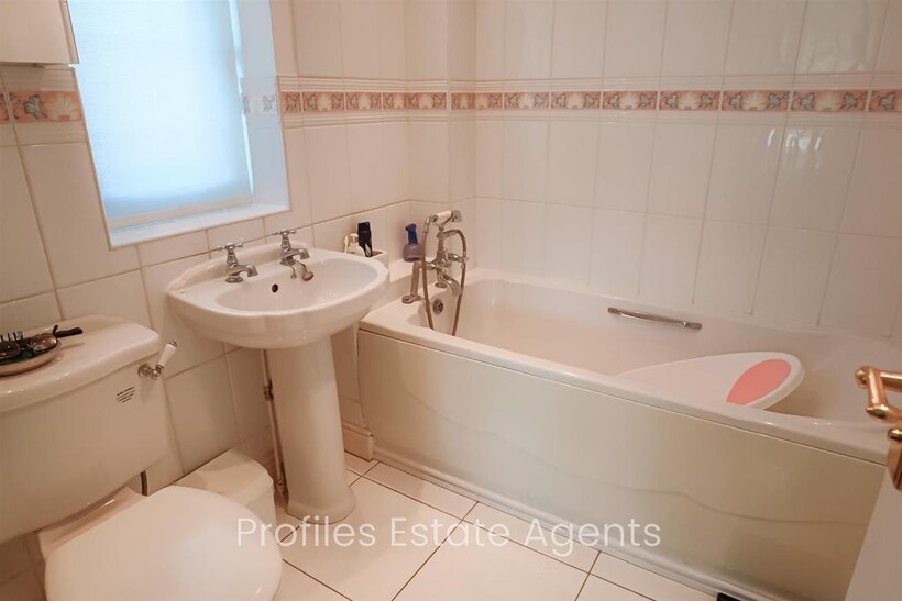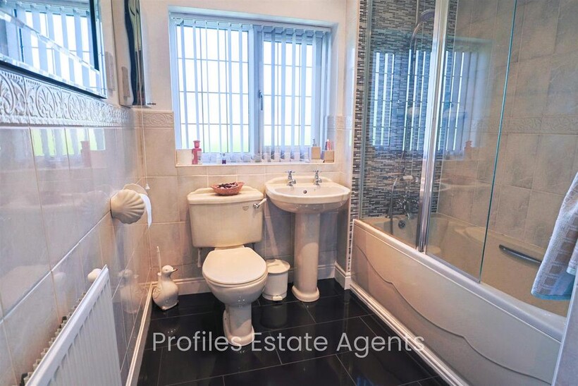 Modern Bathroom (Rear) - 2.68 *(max) x 2.20 (max) (8'9" *(max) x 7'2" (max) - Full suite, panel bath with chrome mixer shower and side glazed screen, wash hand basin, low flush wc.obscure PVCu double glazed window, radiator, ceramic tiled floor, downlights to the ceiling, shaver p