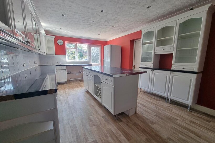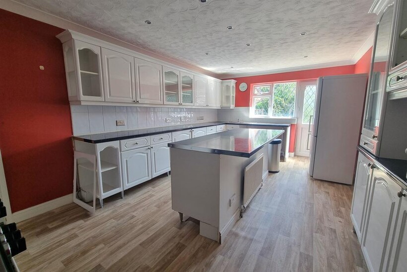 The ground floor includes a large kitchen fitted with extensive cupboard space and a central island, with direct access into the garage for convenience. There is also a ground floor bedroom, an additional reception room, and a WC.