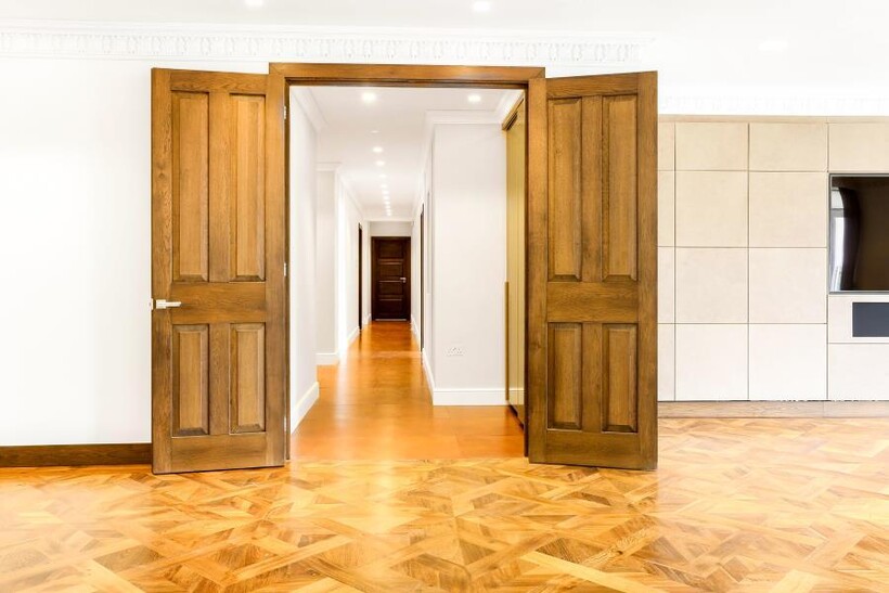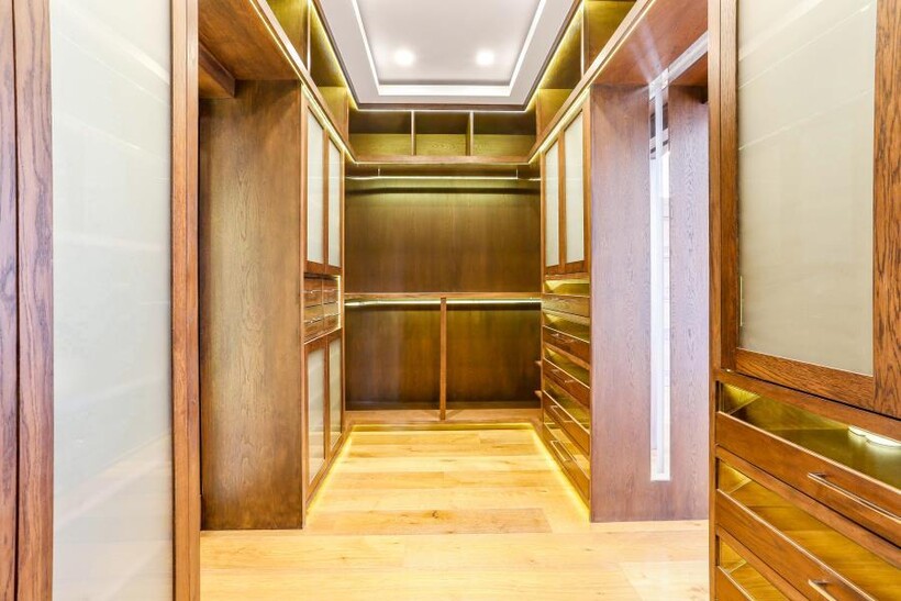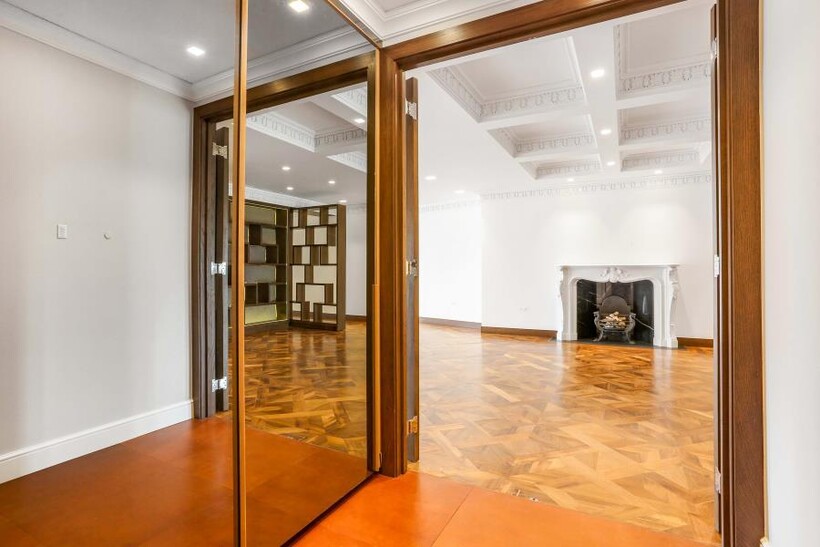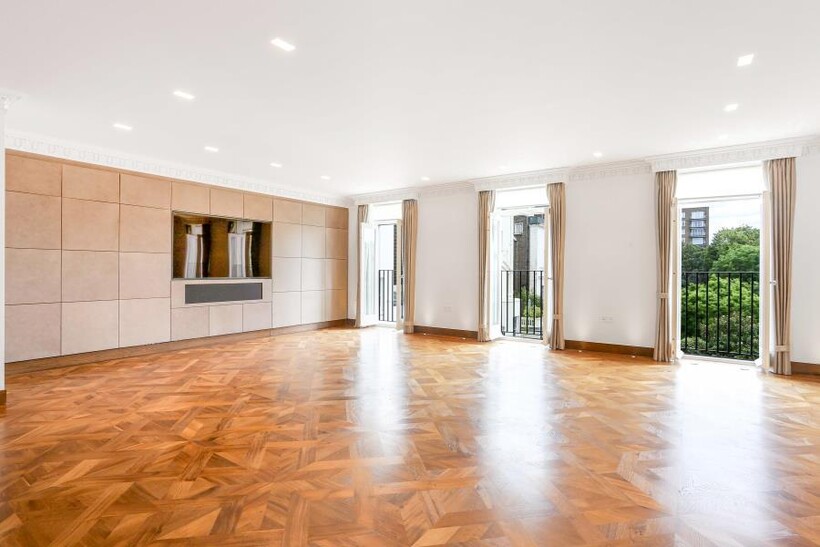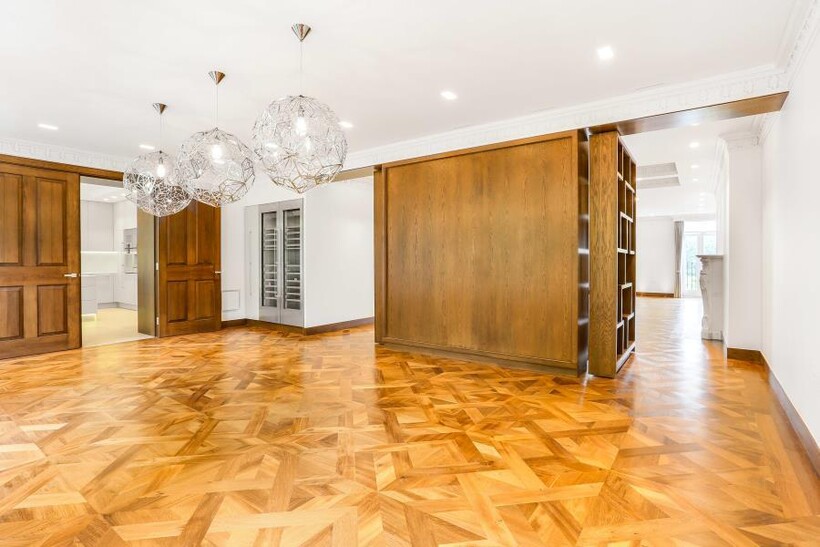 The apartment benefits from bespoke custom-built storage, wood floors throughout, high ceilings, original features and high-end fixtures and fittings including marble bathrooms and Gaggenau appliances.