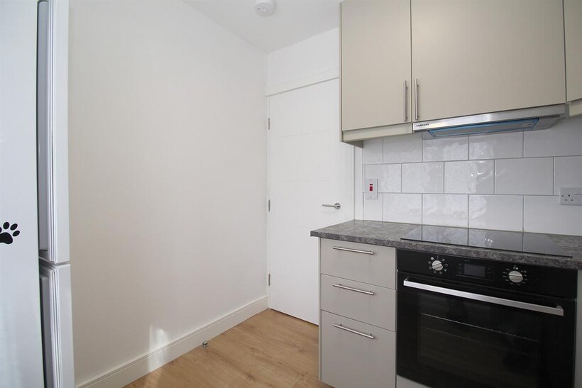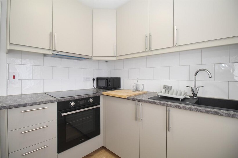 A communal modern L-shaped kitchen, including a fridge/freezer, oven, and hob.