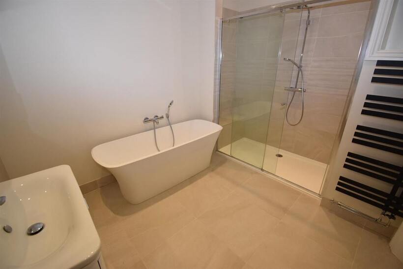 The raised Master Bedroom is set on the next floor and is spacious, elegant and bright. With double doors leading to the Master Ensuite. This bathroom has a walk in shower, there is also a modern freestanding bath.