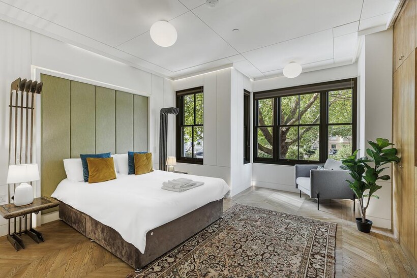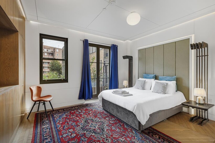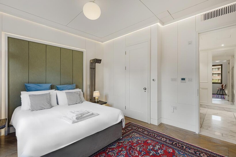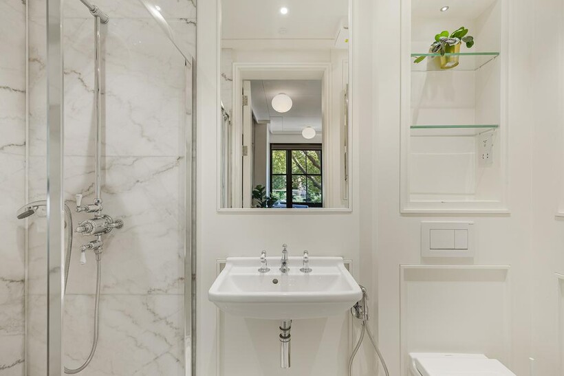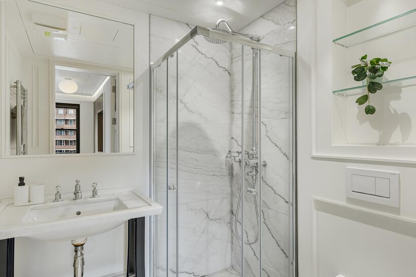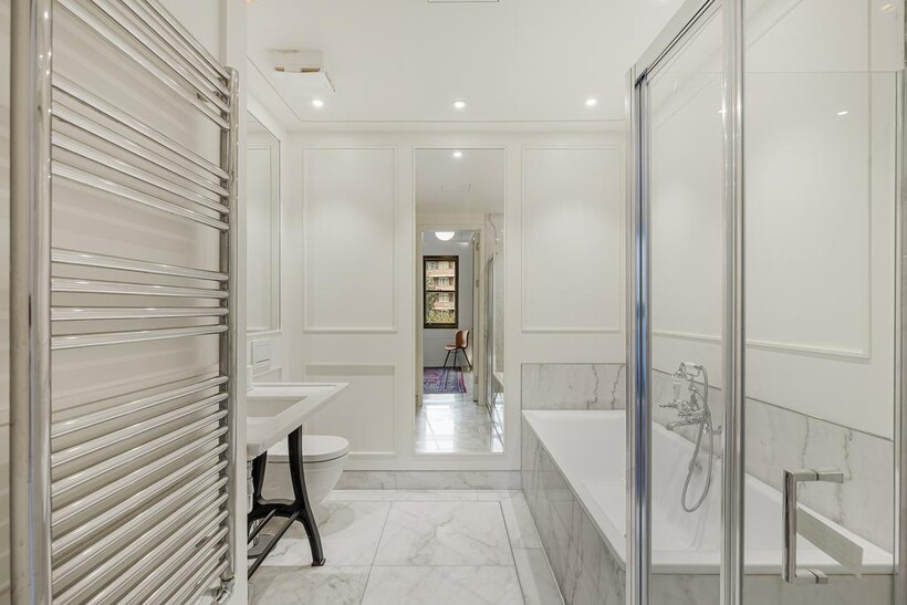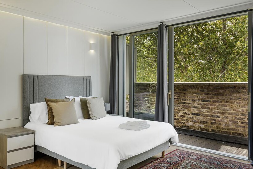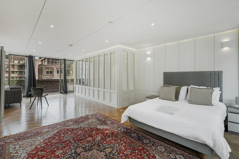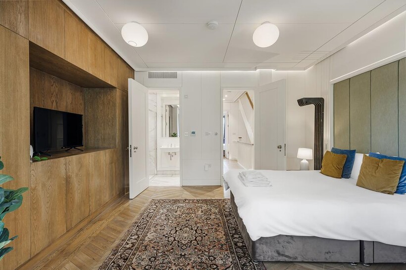 This stylish five-bedroom apartment offers generous living space across multiple levels, featuring ensuite bathrooms in every bedroom for maximum privacy and convenience. Designed with natural materials and a modern aesthetic, the home boasts beautiful wooden flooring throughout and a sleek internal staircase connecting its spacious layout.The narrow-plan living room is flooded with natural light through floor-to-ceiling glass doors, opening onto a private view and complemented by soft, modern furnishings.