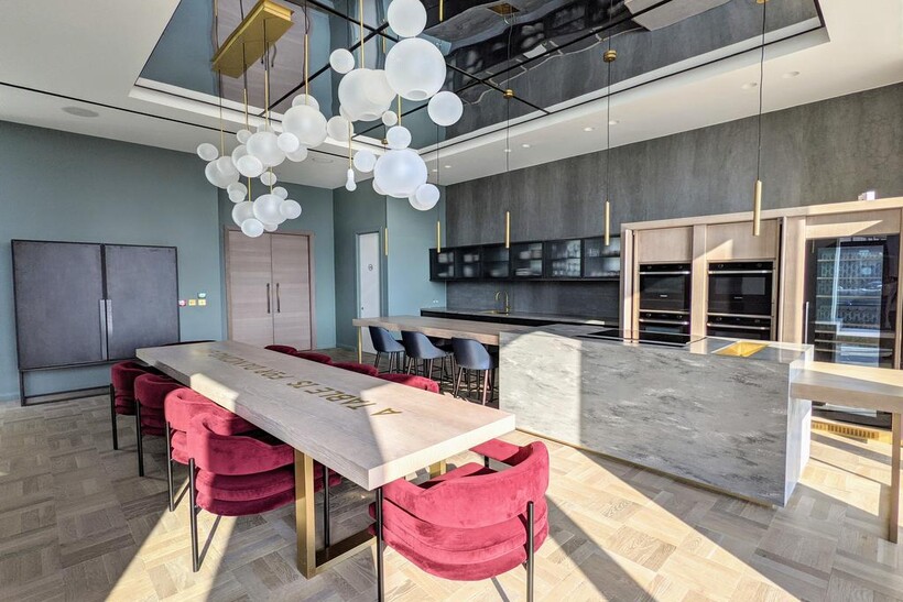 Open plan, sleek and modern with quartz worktops and integrated Samsung appliances including touch control ceramic induction hob, dual fan oven, microwave, separate stacked fridge and freezer, dishwasher plus washer/dryer. Room to entertain with marble effect dining table and four chairs.