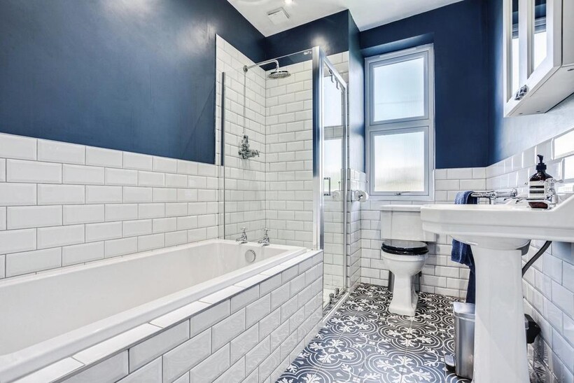 White suite comprising rectangular bath, separate shower cubicle, pedestal wash basin, WC, tiled surrounds and flooring, chrome towel rail/radiator, inset spotlights.