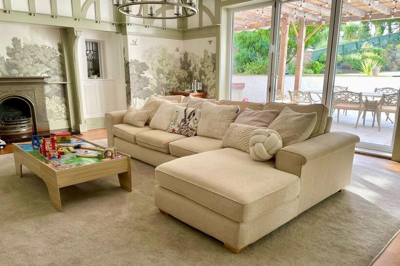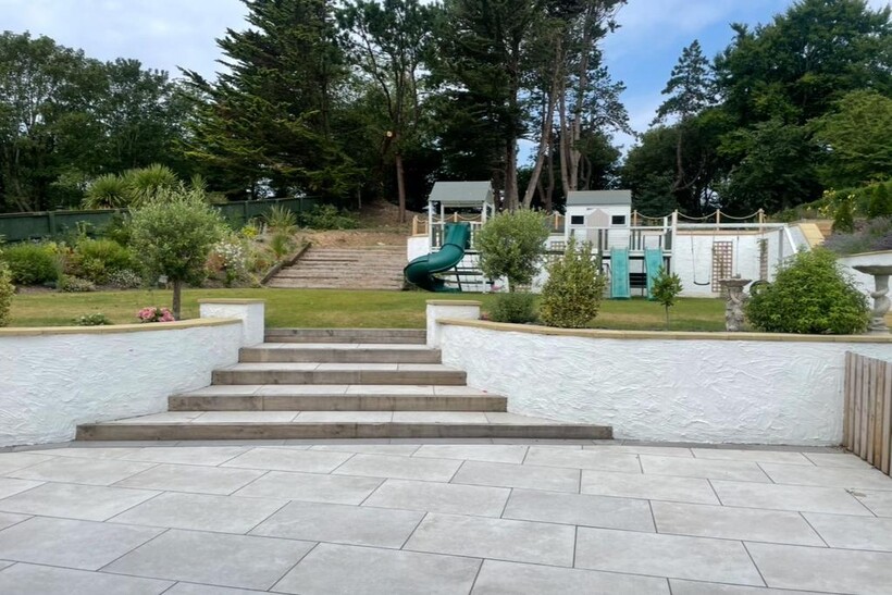 The rear garden enjoys an extensive wraparound terrace, including a covered area designed for a jacuzzi and outdoor dining—perfect for entertaining or relaxing. The grounds have been beautifully manicured and landscaped, featuring a dream children’s play area. Steps lead to a dedicated section of the garden that has been set aside to accommodate an outdoor gym, creating an exclusive wellness retreat within the privacy of your own grounds.
