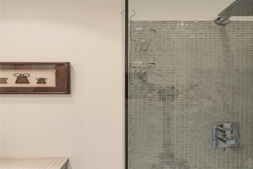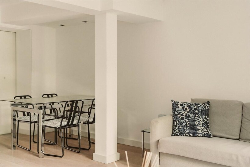 The contemporary kitchen features sleek white cabinetry, integrated appliances, and flows into the reception area with glass dining table. The well-proportioned bedroom is positioned at the front of the flat and offers built-in storage. Two modern bathrooms complete the accommodation, presented in superb condition throughout with wooden floors and recessed lighting creating a refined contemporary style.