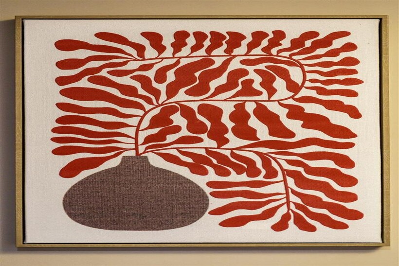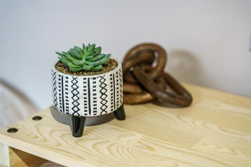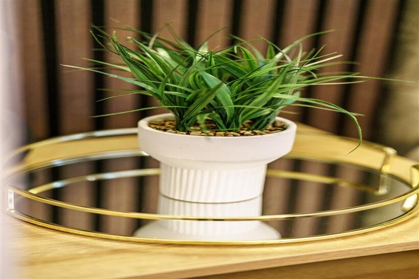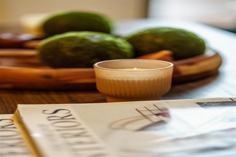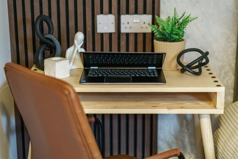 * Seating area with a sofa and wall mounted smart TV