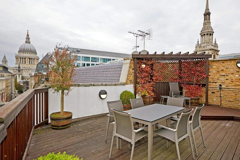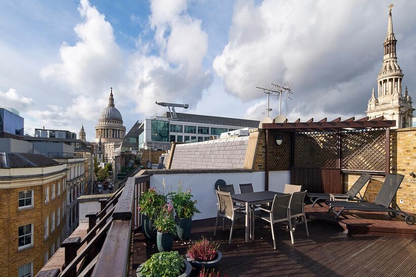With views over the dome of one of London-s most iconic buildings, St. Paul-s Penthouse is the ultimate way to experience a luxury lifestyle in the heart of the capital city, for three months or more. Your finely furnished apartment will provide you with ample space for comfortable living and relaxation, whilst being just moments away from the bustle of galleries, markets and arts centres. From royal weddings to famous burials, St. Paul-s Cathedral has played a major part in the history of London. Your penthouse will overlook its spectacular dome and the culture that surrounds it. Unwind after a busy day in your spacious lounge and reception area, complete with comfortable sofas, flat-screen TV and top of the range furniture. This open-plan room also includes a fully-fitted kitchen, with plenty of workspace, a washer/dryer, fridge-freezer, Nespresso coffee machine and modern appliances for your everyday use. The master bedroom benefits from double wardrobes and an en-suite with a large bath and overhead shower. In the second bedroom, you-ll find modern built-in wardrobes and a small double bed dressed with the finest linen and duvets. The second bathroom is situated off the main hallway and, like the en-suite, is fully equipped with complimentary toiletries from Arran Aromatics and other luxury essentials, such as bathrobes and soft towels. Enjoy the unique opportunity of al-fresco dining from the comfort of your own home, as the penthouse-s staircase leads you to a beautiful sunroom and roof terrace. From here, you-ll have further views of the cathedral. There-s no better way to experience desirable location of Cheval Calico House. St. Paul-s Penthouse provides you with all the perks of city life, whilst spoiling you with endless home comforts. From culture and cuisine to the finest hospitality, you-ll find it all here. Key Services & Amenities included • All utilities (gas, water, electricity and council tax) • Fully air-conditioned apartments with individual controls in every room • 24/7 Concierge and Security • Housekeeping service and change of linen and towels once per week • Complimentary Wi-Fi