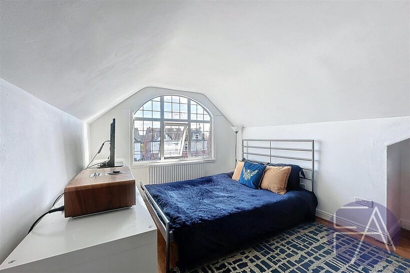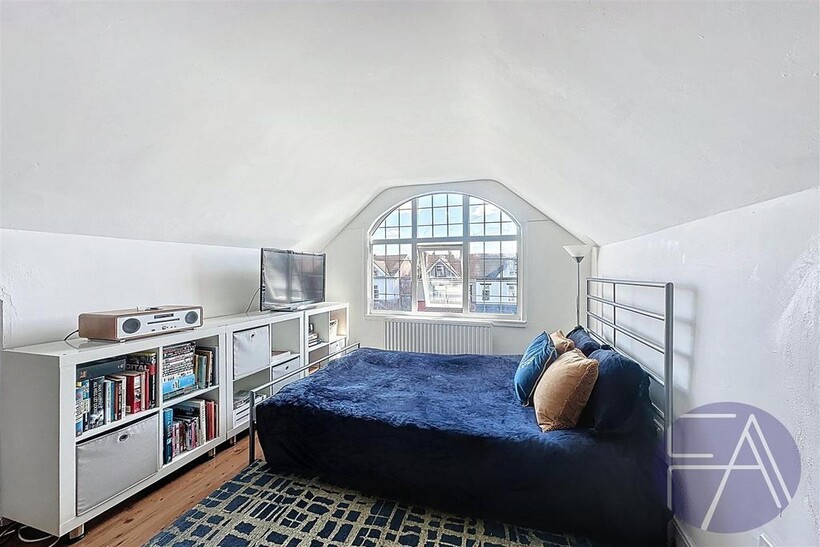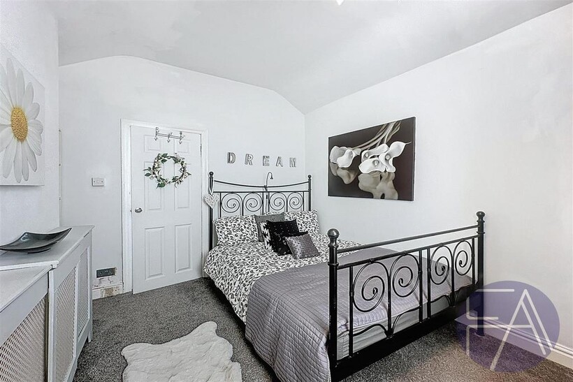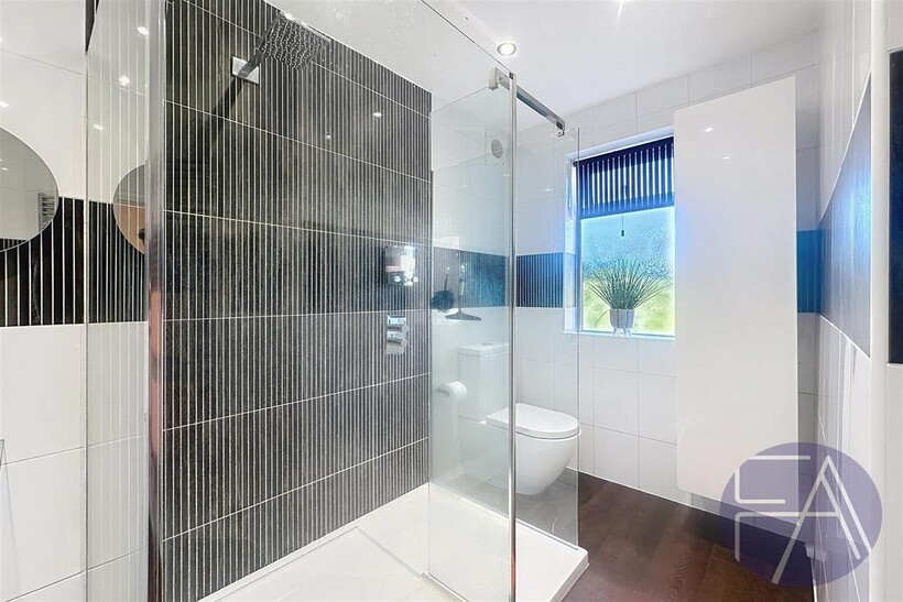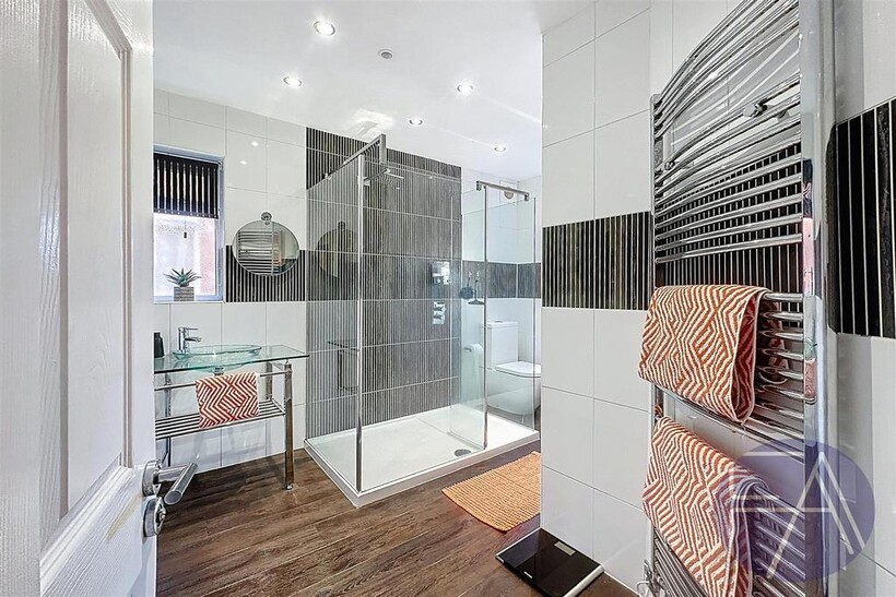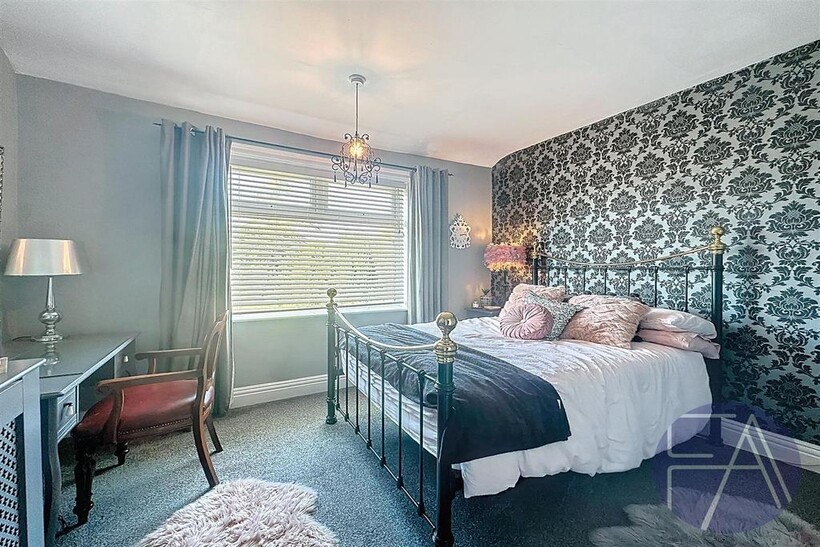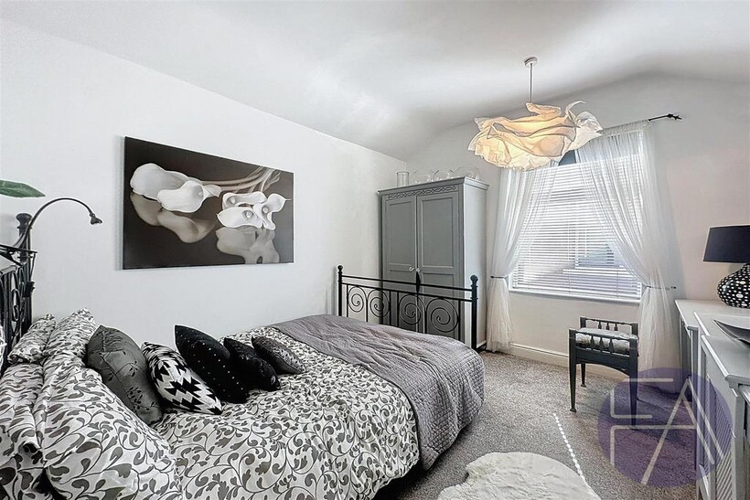 On the first floor, the property boasts three generously sized double bedrooms—one featuring a bay window—and a contemporary three-piece shower room.