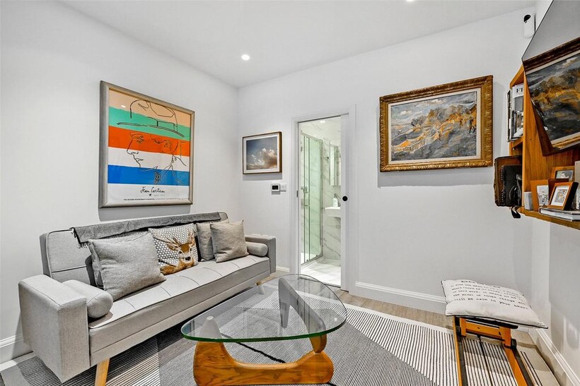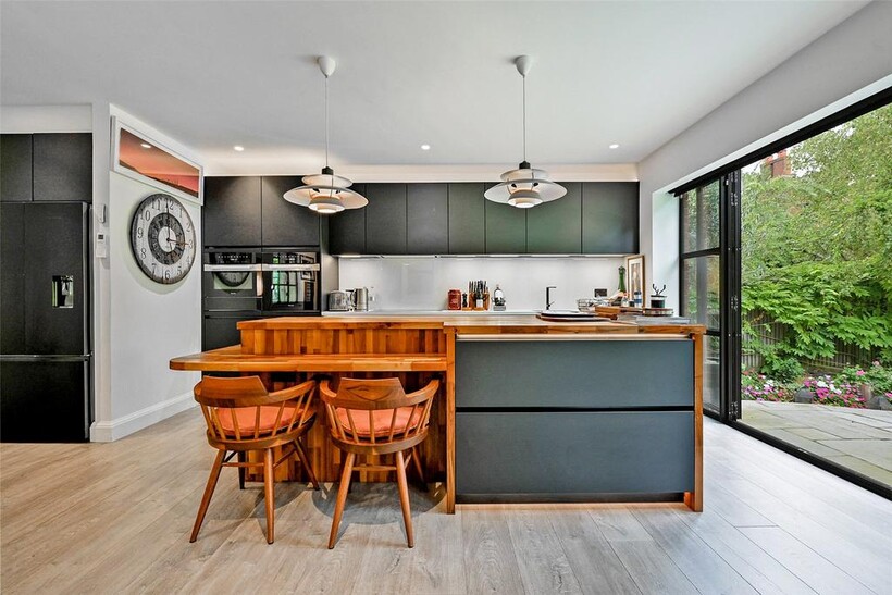 The ground floor opens into a striking open-plan kitchen and reception area, designed for both everyday comfort and entertaining. With sleek cabinetry, integrated appliances, and a central island that doubles as a breakfast bar, the kitchen flows seamlessly into the living and dining zones. Large windows and sliding doors connect the space to the garden, creating a bright, sociable hub with a strong indoor-outdoor feel. Also on the ground floor is a separate room that could serve as a bedroom, study, or snug, alongside a utility room tucked away for practicality. Upstairs, the first floor offers two further bedrooms and a family bathroom, while the top floor is dedicated to a spacious loft-style bedroom with useful eaves storage.
