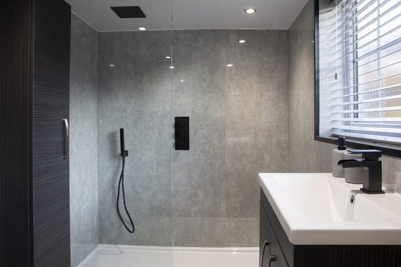 Modern bathroom with walk-in shower and hairdryer
