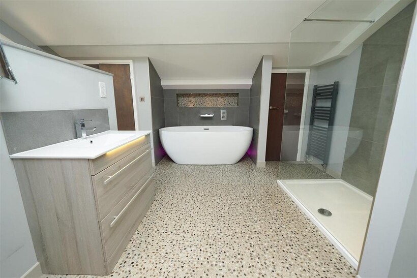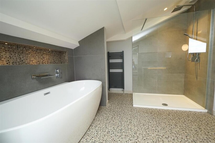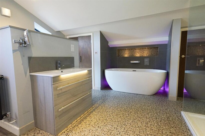 To the first floor is an impressive master suite with built-in TV, and four piece bathroom suite comprising stand alone bath, large separate shower, toilet and basin.
