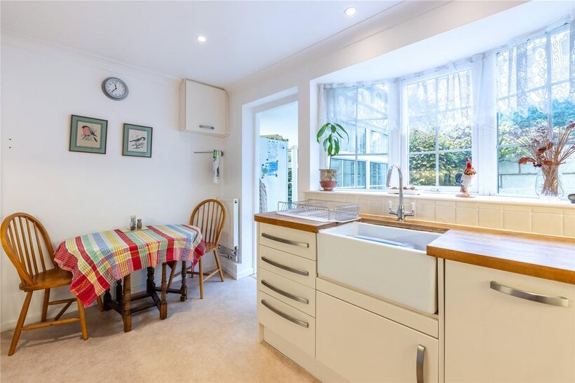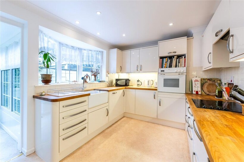 The kitchen is fitted with a range of wall and base units with hardwood worksurfaces and inset Belfast sink, with concealed dishwasher adjacent. There is a single oven and hob, both of which are electric.
