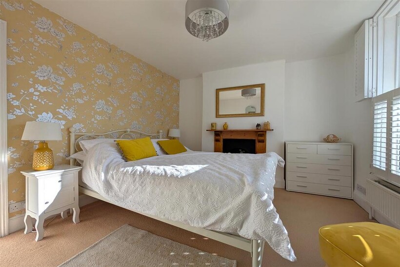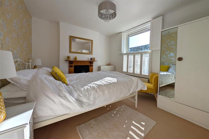 Bedroom 1 - Double room, fitted carpet, a radiator, feature fireplace and a double glazed window to front elevation with wooden shutters.